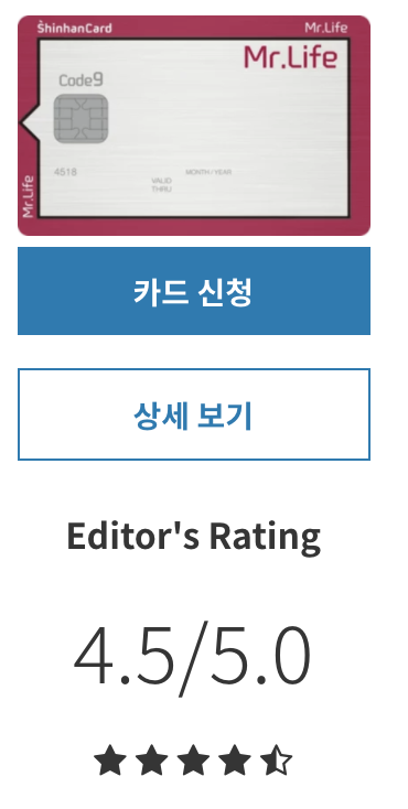 신한 Mr. Life 카드의 혜택을 상세히 요악하였습니다. 이 곳에서 밸류챔피언의 결과를 비교 및 확인해보세요.
