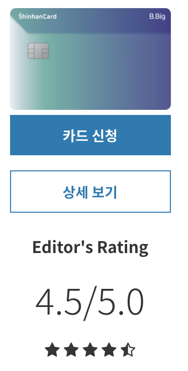 신한 B.Big (삑) 카드의 혜택을 비교 및 분석하였습니다. 이 카드를 밸류챔피언에서 쉽게 알아보세요.