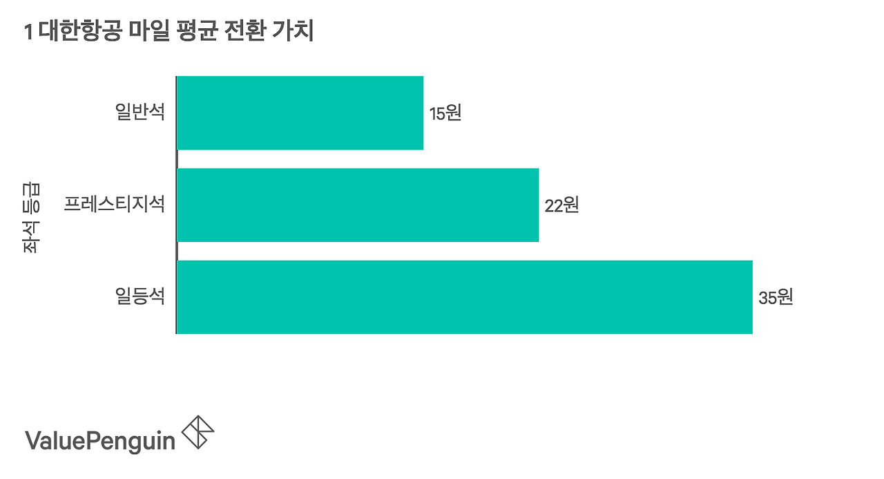 저희 조사에 따르면 대한항공 마일리지는 프레스티지석과 일등석 전환 혹 업그레이드 시 최고의 가치를 보유하고 있습니다. 구체적으로 프레스티지 혹 일등석 좌석으로 전환 시에는 각각 1마일당 22원 그리고 35원으로 집계되었습니다. 유사히 좌석 업그레이드 시에도 비슷한 전환율이 제공되어 보유하신 마일리지를 프리미엄 좌석 위주로 사용하시는 것을 추천드립니다.