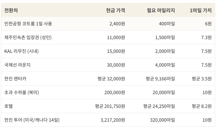 일본, 중국, 동남아, 서남아, 유럽, 대양주, 그리고 북미에 분포된 15개의 도시 대상 성수기 왕복권 구매 금액을 대한항공 항공권 공제 마일리지표에 명시된 마일리지와 대조해본 결과, 대한항공 마일은 평균 12원의 가치를 보유하고 있다고 조사되었습니다. 즉 성수기에 주로 여행을 가시는 상당수의 소비자 분께서는 언급된 가치로 항공권을 제공받으실 수 있습니다. 하지만 도착지와의 거리 차이에 따라 마일의 가치가 상이할 수도 있습니다. 예를 들면 미국과 유럽 등의 장거리 여행 시에는 최대 15원 그리고 하노이 및 도쿄 등의 단거리 여행 시에는 최저 8원으로 마일리지 전환이 가능합니다. 반면에 제주 여행 시에는 국내임에도 불구하고 1마일을 최대 14원으로 전환하실 수 있다고 조사되었습니다.