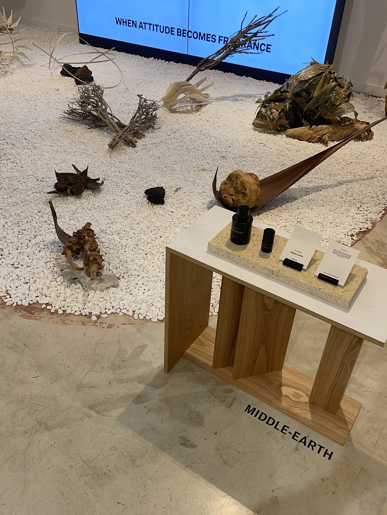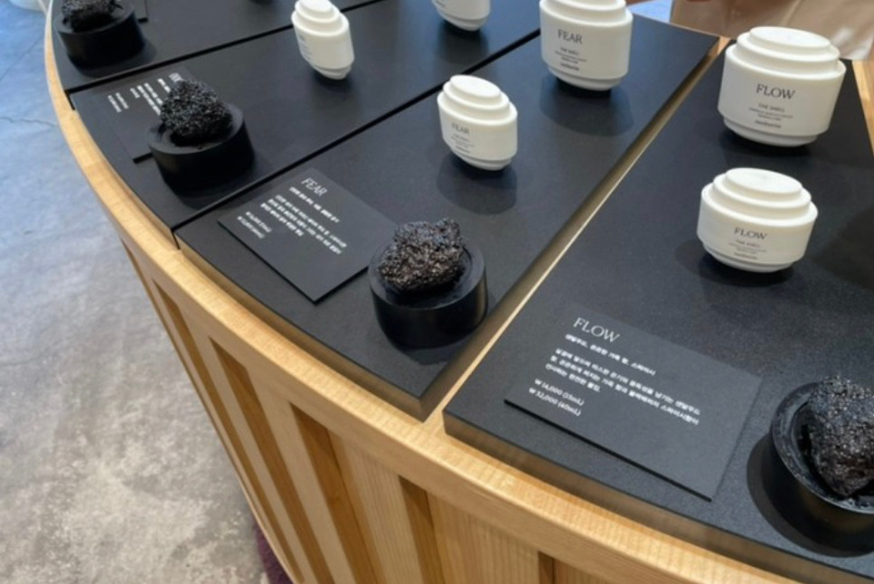 그렇게 매장 한가운데에 서 있는 말에게 한 방 맞은 나는, 그들의 디테일한 경험 설계를 발견하고 인정하지 않을 수 없었다. 새롭게 선보이는 향수 제품을 포함해 그들의 핸드크림이나 손세정제 제품은 대부분 '향'을 중요하게 다루고 있다. 그래서 모든 제품을 시향 할 수 있도록 구성하고 있는데 그 방식과 경험이 너무나 색달랐다. 그들은 제주도 화강암과 같은 원물 소재를 통해 시향 하도록 하여, 그들이 추구하는 자연주의 컨셉의 체험을 자연스레 유도했다.