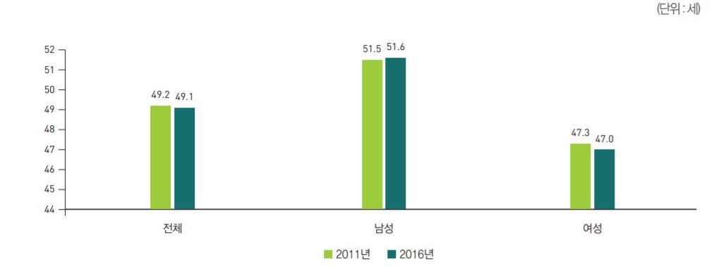 국내 근로자의 평균 퇴직 연령은 남성은 51.6세, 여성은 47세로 나타났다. <한국 고용정보원, 2017>