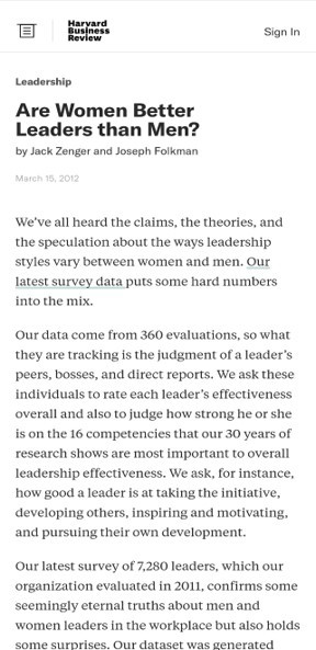 Harvard Business Review 연구는 리더십 효율성에 가장 중요한 것으로 입증된 15개의 역량을 고려하여 남성 리더십과 여성 리더십을 30여 년간 조사했는데요. 여성 리더들은 관계를 형성하는 과정에서 남성 리더보다 높은 능력을 갖추고 있음을 밝혀냈습니다. 리더십의 핵심 특징인 정서적 지능은 업무 지향적인 특성보다 사람 관리에 집중할 때 더 잘 발휘되는 경향이 있는데요. 이 연구에서 여성은 특히 남성보다 공감 능력이 뛰어나 리더십에 큰 장점을 가지고 있다고 말합니다. 그런데 이렇게 여성관리자는 남성관리자보다 더 높은 리더십 역량을 가진 것으로 평가받는 조사결과가 나왔으나(Zenger & Folkman, 2012), 여성은 남성에 비해 리더십 자기 효능감이 낮고(McCormick J,. Tanguma, J., Lopez-Forment, A,, 2002), 경력열망 또한 낮은 편(Shin, Kim, & Jung, 2017)으로 보고되었습니다. 이는 여성이 자신의 성공이나 성과에 대한 자기 확신의 부족으로 스스로 전통적 성 고정관념에 얽매여 자신의 잠재적 능력을 발휘하지 못하는 경향으로 볼 수 있다는 것입니다.