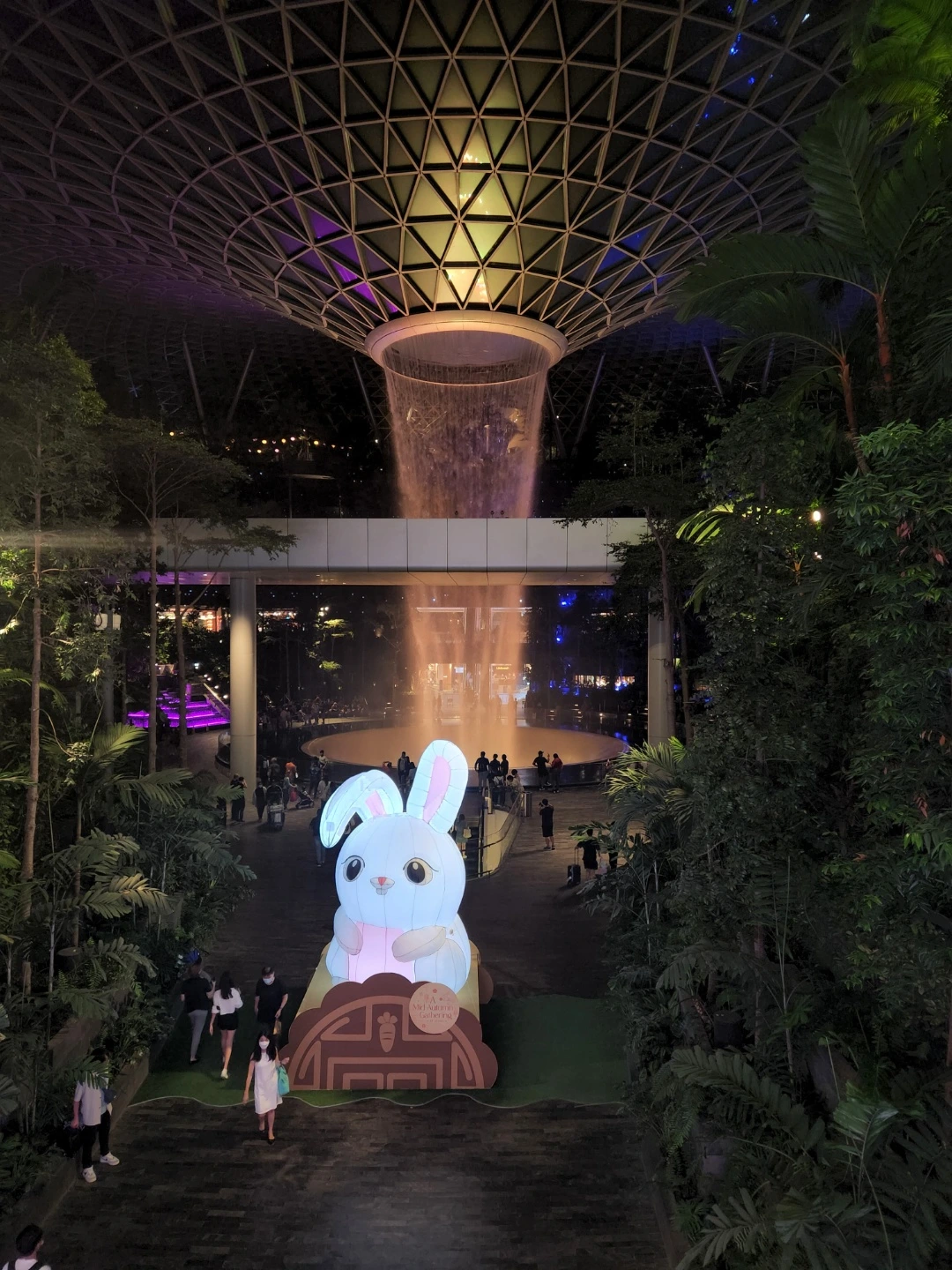 쥬얼 창이는 2019년 4월 17일에 개장한 10층 규모의 복합단지로 주차장 부지에 지은 복합 쇼핑몰이다. 레스토랑 상점이 있고 그 중심에 인공폭포가 있다. 세계에서 가장 높은 인공폭포라고 한다. 경유를 하는 사람들 입장에서는 시간 때우기에 좋은 곳이라는 생각이 들었다. 이곳의 실내정원은 싱가포르 마리나 베이 샌즈 건물을 설계한 건축가로 유명한 모세 사프디가 디자인했다고 한다. 원래 밤 9시 45분에 랑카위에서 싱가포르로 도착할 예정이었던 우리는 9시 20분 즈음 터미널 3에 도착해서 버스를 타고 쥬얼 창이로 향했고 10시 전에 운 좋게 현란한 폭포 쇼를 볼 수 있었다. 쥬얼 창이에 일찍 도착할 줄 알았더라면 랑카위 공항 맥도널드에서 빅맥을 먹지 않았을 터였다. 점보 시푸드 등 유명한 레스토랑이 즐비했고 커피빈과 파리바게트도 있었다. 우리는 노곤한 몸을 이끌고 다시 터미널 3으로 향해서 새벽 비행기를 기다리며 꾸벅꾸벅 졸았다. 그래도 쥬얼 창이에서 1시간 반 가량 보냈던 터라 시간은 금방 휘리릭 지나갔다. 쥬얼 창이에서 송파 바쿠테를 한 번 더 먹었다면 좋았을걸 아쉽다. 바쿠테여, 한국으로 들어오라! 갈비탕 가격이 12000원~15000원이라 한다 치면 음료 2, 밑반찬 1가 포함된 토털 가격이 41000원 정도였기에 나쁘지 않은 가격이란 생각이 든다. 바쿠테에서는 옆 테이블에 일본 썸남썸녀가 앉아 있었는데 언뜻 들리는 바로는 선후배 사이 같아 보였고 일본 청춘 영화 주인공처럼 느껴졌다. 그들도 우리가 한국 청춘 멜로 영화 주인공 같았겠지?