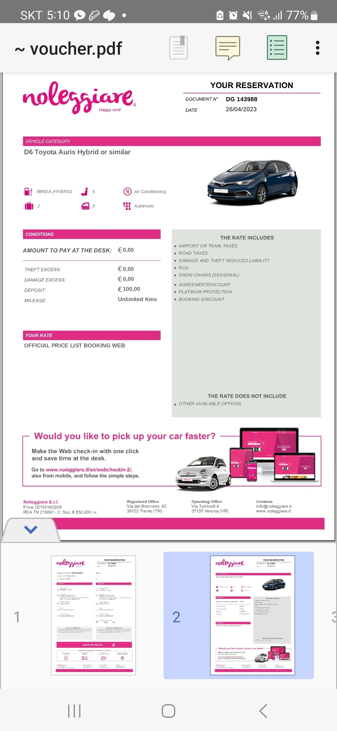 일단, '하이브리드'가 있다면 무조건 하이브리드를 선택하길 추천드린다. 하이브리드는 '수동'이 없기에 '자동' 차를 배정받을 수 있고 친환경을 중시해서 할인 프로모션도 하니 할인 프로모션을 노리시길 바란다. 20~30% 정도 할인받을 수 있다. 그리고 나는 미처 생각하지 못했던 부분을 언급드리자면 렌트 시작 시간과 반납 시간을 설정할 때 동일한 시간대로 하시길 바란다. 예를 들어 2023년 6월 18일 16:00에 렌트를 했다면 반납을 6월 21일 16:00에 하는 것이 가장 좋다. 우리 가족의 경우 돌로미티 여행에 대한 감이 없었던 내가 어중 떠중 정보만 보고 18:00에 반납하는 게 좋을 것 같다고 생각하고 18:00으로 했다. 우리나라의 경우 일 개념으로 하루치를 치는 반면, 이탈리아는 16:00시 기준으로 하루를 설정해서 16:00 시 기준으로 2시간이 넘어가면 하루가 더 늘어나는 꼴이 되었다. 내가 16:00에 렌트를 했던 이유는 산악지대인 돌로미티에 밤늦게 도착하면 위험할 것 같기 때문이었는데 18:00에 빌려서 18:00에 반납하는 것도 나쁘지 않을 것 같다고 생각했다. 왜냐하면 돌로미티가 로마보다 백배는 안전하기 때문이다. 소매치기라곤 찾아볼 수 없으며 등산을 사랑하는 사람들이 모여 있기에 다들 선하다고 해야 할까, 아무튼 위험하지 않다. 우리가 렌트한 차량은 D6 Toyota Auris Hybird였다. 보험은 혹시 몰라서 Full Cover로 Platinum을 했다. 실제로 Platinum을 하면 반납할 때 기름이 풀로 채워져 있는지만 확인하고 나머지는 체크도 안 했다. 그런데 보험을 좀 낮게 들면 흠집 등 세세하게 체크한다고 했다. 어쨌든 외국에서 차를 몰다 보니 풀 커버를 해야 안심을 할 수 있을 것 같아서 풀 커버를 했는데 후회 없다. 4월 26일쯤 616,832원(407.36 EUR)으로 결제했다. 시간을 맞췄더라면 더 싸게 했을 수도 있을 듯하다. 베니스공항 렌트-베니스 공항 반납이 제일 저렴해서 장소도 동일하게 했다.