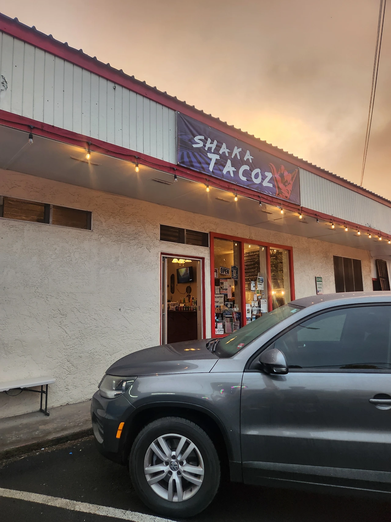 그렇게 Hikiau Heiau에서 날씨를 만끽하다가 구글링 해서 발견한 Choice Mart에 가기로 했다. 무스비와 포케가 유명하다고 해서 갔으나 무스비는 모조리 품절이었고 포케 몇 개만 남아서 포케만 테이크아웃했다. 그 외에 우리의 애정템 제로콜라, 빅웨이브 맥주, 고구마칩, 감자칩 등등을 사서 <블랙락 피자>로 향했다. 시그니처 피자인 클래식 콤보를 시킨 후, 근처 <Shaka Tacoz>에 걸어가서 피시 타코 3개를 시켰다. 상대적으로 고도가 높아서인지 이곳에서는 갑자기 보슬비가 왔는데 비를 맞으면서 걷는 것도 정말 행복했다. 어스름한 산기슭에 햇빛 한 줄기가 비치는데 조명마저 누르스름해서 굉장히 몽환적인 광경이 연출되었다. 우리는 타코를 테이크아웃했지만 <Shaka Tacoz>의 뷰가 환상적이라 이곳에서 먹어도 좋겠다는 생각이 들었다. 그렇게 음식 두 개를 테이크아웃해서 맛있게 먹고는 저녁 9시쯤 숙소에 도착했다.