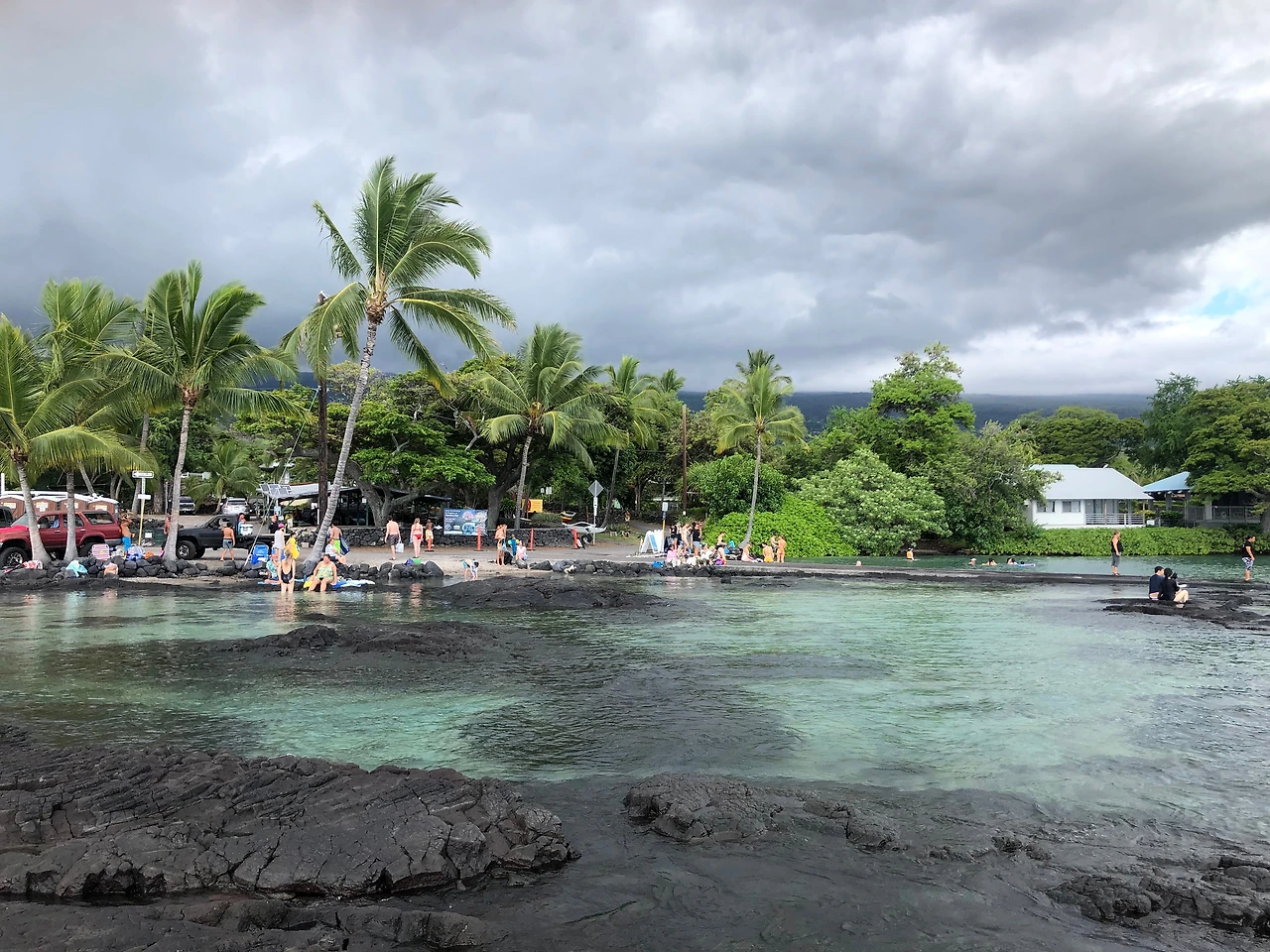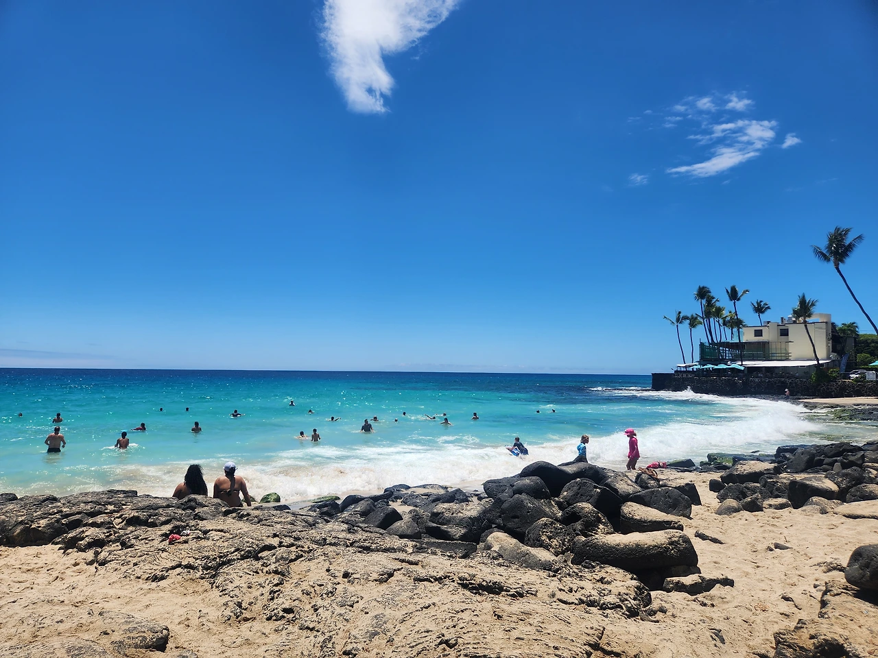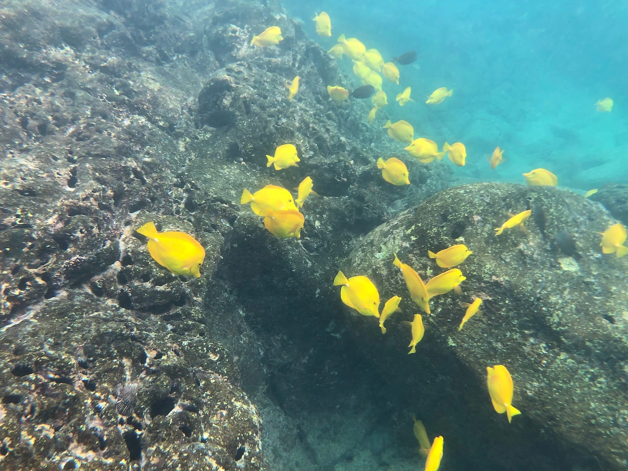 그렇게 투어를 후다닥 끝내고 남편은 푸우혼우아 호노노 국립역사공원에 가자고 했다. 역사를 그다지 좋아하지 않는 나는 달갑지 않았지만 일단 남편이 가보자고 해서 오케이 하고 구글링을 시작했다. 이것저것 검색하다 보니 우리의 목적지 푸우혼우아 근처에 스노클링으로 유명한 Two Step Beach가 있는 게 아닌가! 노란 열대어를 많이 볼 수 있다며 남편에게 스노클링을 하러 가자고 했다. 한국인 후기 중에서도 스노클링 스폿 중에 단연 탑으로 꼽는다는 후기가 심심치 않게 있었던 터라 기대감에 부풀었다. 스마트키가 바닷물에 젖어서 보험사 부르고 했다는 섬뜩한 후기를 보고는 아차 싶었다. 짐을 둘 곳이 없으니 각자 들어가서 스노클링을 해야 하지 않나 싶어 한 명씩 들어가기로 했다. 수영을 잘하는 남편은 혼자 들어가더니 요리조리 헤엄치다가 수중에서 물고기 사진을 찍어오기까지 했다. 바다 수영은 너무 오랜만이라 주저하던 나는 처음에 짠내를 마시고 으웩 했다. 입으로만 숨을 쉬어야 하는데 코로 숨을 쉬니까 틈 사이로 바닷물이 들어와서 괴로웠다. 그러다가 조금 요령이 생겨서 바닷물이 더 이상 두렵지 않아서 노란 열대어들 사이를 유유히 헤엄쳤다. 그래도 짠내가 내 온몸에 뱄던 터라 너무나도 찝찝했다. 1시간가량 스노클링을 즐기고 나서 짠내를 씻어낼 샤워실을 찾는데 샤워실이 없었다. 사실 나는 짠내 그대로 가도 되지 않을까 싶었는데 남편은 씻어야 한다며 구글링 해서 샤워실을 찾아냈다.