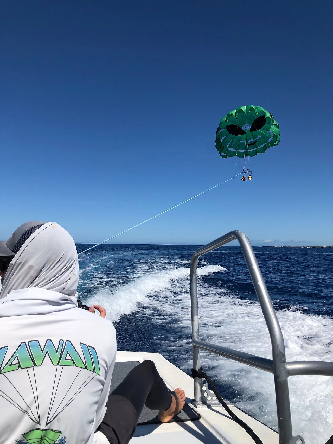 재작년에 말레이시아에서 제트스키를 타고 대실망했던 터라 실망하면 어쩌지 하는 걱정은 있었지만 왠지 푸르른 바다와 하늘 사이에 둥둥 떠 있으면 환상적일 것 같다고 생각했다. 콜롬비아 산힐에서 했던 패러글라이딩을 하면서는 스릴감보다는 안정감을 느꼈던 터라 놀이기구 타듯이 타는 패러세일링은 더 스릴이 넘칠 것만 같았다. 사실 패러세일링 선택지 자체는 본섬이 더 많았고 가격도 합리적이었지만 1200피트까지 올라가는 게 코나밖에 없어서 코나에서 하기로 했다. 9시 반쯤 모여서 크루한테 이런저런 설명들을 듣다가 9시 50분쯤 배를 타고 패러세일링을 하는 곳으로 향했다. 나는 뱃멀미를 하는 편이어서 인천공항 약국에서 멀미약을 미리 사서 들고 갔다. 실제로 뱃멀미를 심하게 하지는 않았지만 패러세일링을 하고 내려올 때부터 약간 어질어질했다. 우리는 라틴 계열의 미국인(조상이 멕시칸일 것으로 추정) 가족 5명과 함께 배를 탔다. 미국인 가족은 고프로로 사진과 영상을 찍는 듯했고 우리는 평소에 안 쓰는 아이폰으로 영상과 사진들을 찍어뒀다. 실제로 크루들이 사진을 찍어줬는데(물론 절대 무료가 아니다. 역시 자본주의 끝판왕 미국!) 사진들이 나쁘지는 않았지만 돈을 지불하고 살 정도는 아니었다. 상공에서 우리가 직접 찍어둔 사진과 영상들만으로도 충분히 가치가 있었다. 아이들 3명, 부부 2명, 우리네 2명 이렇게 각각 10분씩 패러세일링을 했는데 정말이지 좋았다. 일단 바다 때깔 자체가 너무 푸르러서 감탄사가 나왔다. 바다를 가만히 바라보고 있으니 푸른 블랙홀에 빨려 들어갈 것 같다는 생각마저 들었다. 자연의 위대함과 거대함을 느꼈다고나 할까. 이러한 대자연 앞에서 나는 한낱 미물에 불과하구나 싶었다.