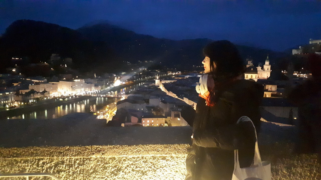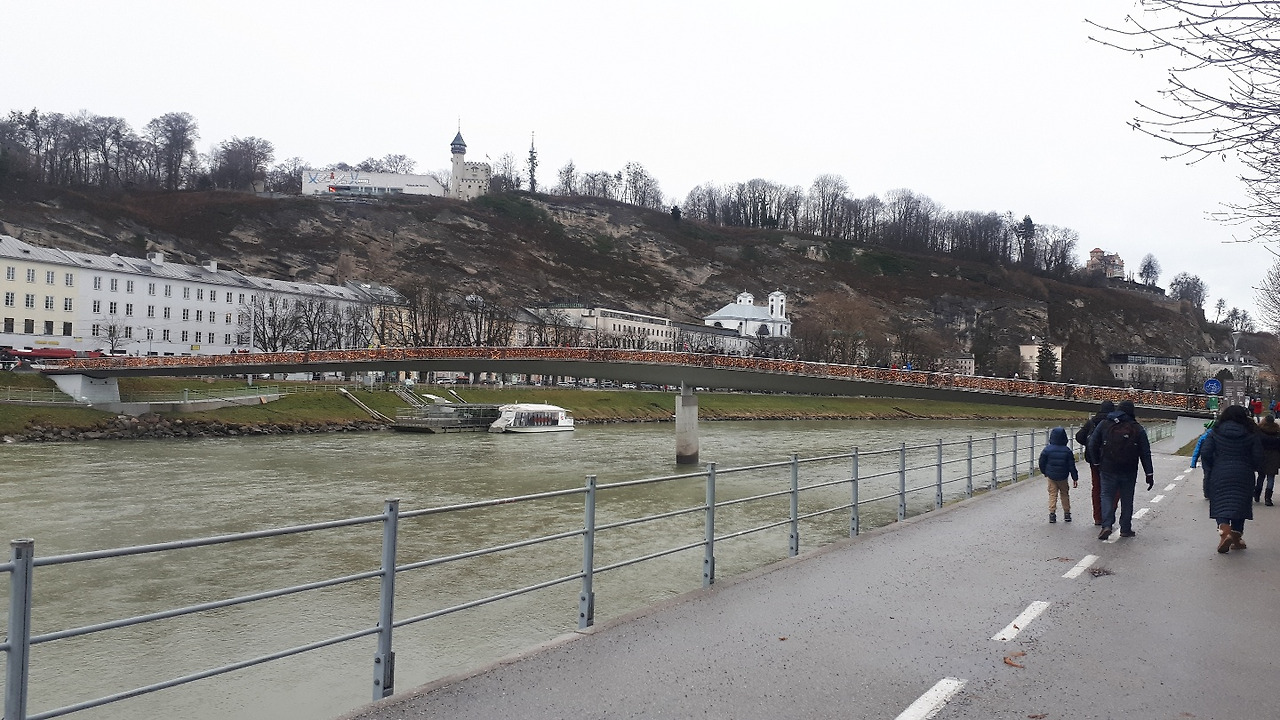 수박 겉핥기로 눈더미에서 뒹굴다가 내려와서는 앞서 언급한 모차르트 생가에 갔다. 그 날 얼마나 추웠던지 지나가던 행인이 롱 패딩 어디서 샀냐고 여기서 샀냐고 묻더라. 한국 롱 패딩 만세. 걷다가 유명하다는 카페를 눈도장 찍어 두고 나서는 사람들이 유난히 많던 마 카르트 다리를 걸어보았다. 마 카르트 다리에는 우리나라 남산타워처럼 다리 난간에 자물쇠가 곳곳에 걸려있다. 영화 <퐁네프의 연인들> 때문인지 퐁네프 다리에서는 '와아' 하며 탄성을 내질렀는데 마 카르트 다리와 나 사이에는 그 어떤 것도 없어서 감흥이 없었다. 걷고 또 걸었다. 이 곳이 어딘지도 알지 못하고 무작정 걷다 보니 대성당 근처의 크리스마스 마켓에 도착했다. 월요일에는 묀히스베르크 전망대를 올라갈 수 없다길래 부랴부랴 그곳으로 향했고 구글맵의 잘못된 안내로 헉헉대다가 야경을 감상할 수 있었다. 묀히 스베 르크에서 보는 잘츠의 풍경이 잘츠부르크 성에서 보는 것보다 낫다길래 기대했는데 엄청난 감흥을 받지 못했다. 다음 날, 잘츠부르크 성에 가서는 엄청난 감흥을 받았다. 잘츠부르크 성 역시 잘츠부르크 카드만 있으면 푸니쿨라를 타고 쉽게 올라갈 수 있는데 지나가는 사람들 따라 하기 좋아하는 나는 앞서 가는 독일인 부부를 졸졸 따라가면서 등산에 버금가는 가파른 오르막을 헉헉 대며 올라갔다. 그렇게 힘겹게 올라갔던 나는 내려갈 때는 푸니쿨라를 타고 내려갔다.