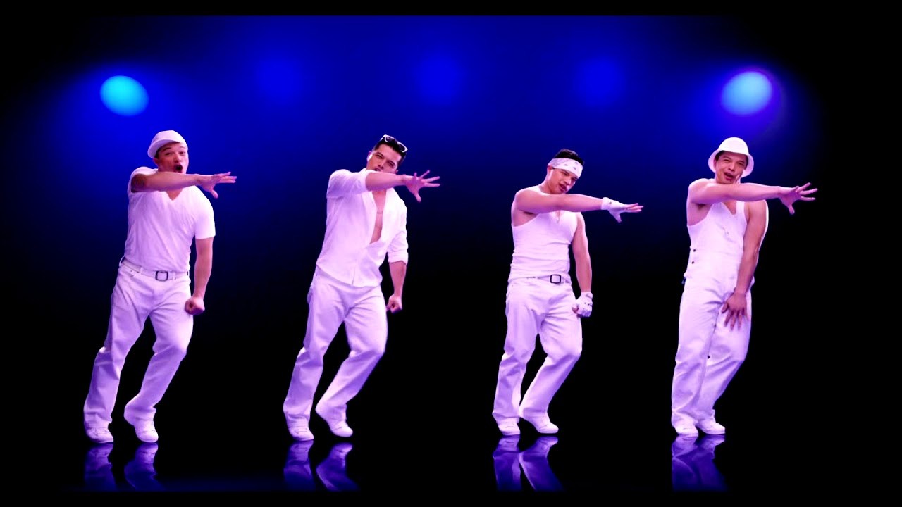 하지만 레베카의 걱정과 다르게 파티는 성공합니다. 초대를 받고 찾아온 조쉬가 SNS에 사진을 올리고 다른 손님들과 어울리면서 지루하기만 했던 파티에 활기가 생기기 시작한 겁니다. 레베카는 조쉬를 감동과 선망에 찬 눈빛으로 쳐다보고 조쉬는 어느 순간 네 명의 보이밴드가 되어서 무대에서 아이돌 노래를 부릅니다. (넘버 제목이 <네 명의 조쉬로 이루어진 보이밴드(A Boy Band Made Up Of Four Joshes)>입니다.)