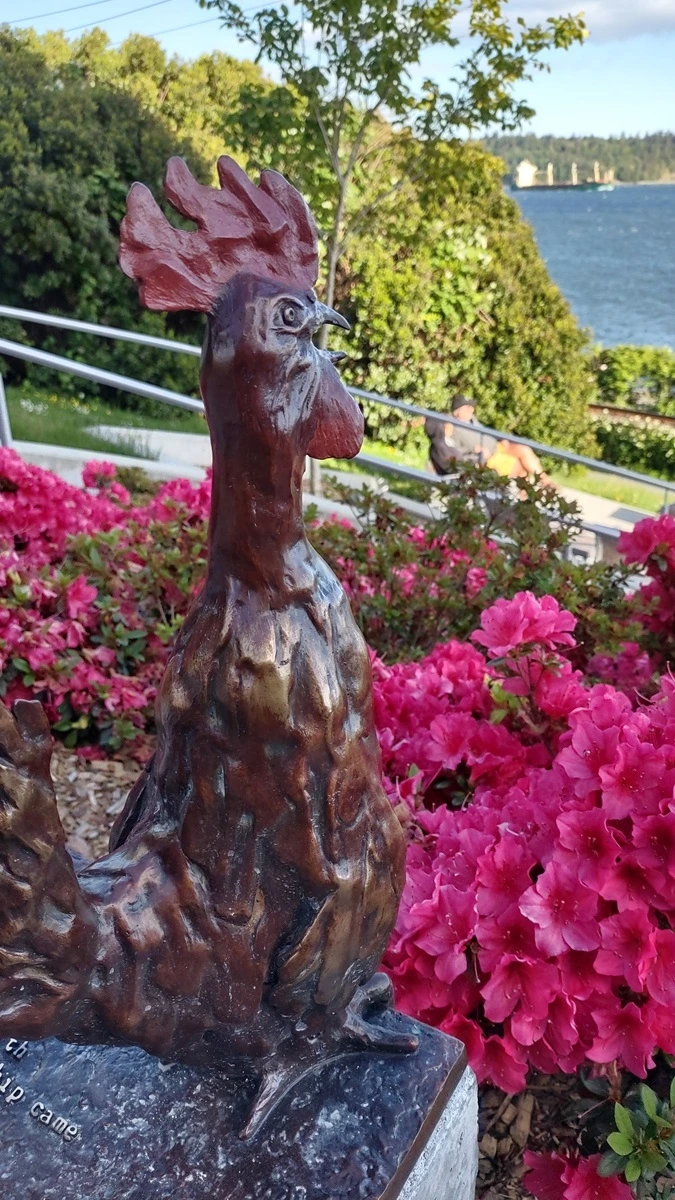 집에서 나와 바닷가로 가는 길에는 꼬끼탁 동상이 세워져 있습니다. 꼬끼탁은 왼쪽으로는 스탠리 파크에서부터 UBC가 있는 밴쿠버 서안까지를 하루종일 지켜보는 재미로 삽니다.