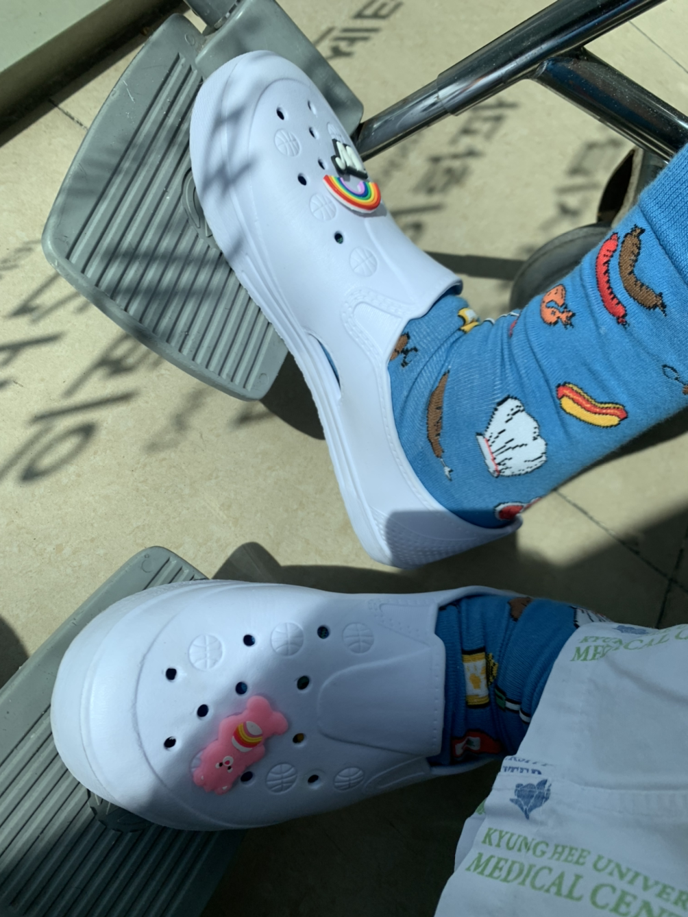 그렇게 시간 때우기 식의 식사를 마치고, 기분전환을 위해 아빠와 내가 정한 햇빛 존으로 향했다. 2층에 어느 복도인데, 밖에 나갈 순 없지만 햇볕이 쨍하게 들어 무르익은 따뜻함을 간접체험할 수 있다. 새로 산 양말도 신어봤는데, 아빠가 남긴 한마디가 잊혀지지 않는다. “참나! 양말이 그림에 떡이네…” 그러고보니 의식하지 않을 땐 몰랐는데, 아빠 눈엔 양말에 담긴 음식들이 참 맛있어 보였나 보다. 웃기고, 또 그런 생각을 한 아빠가 안쓰러웠다.