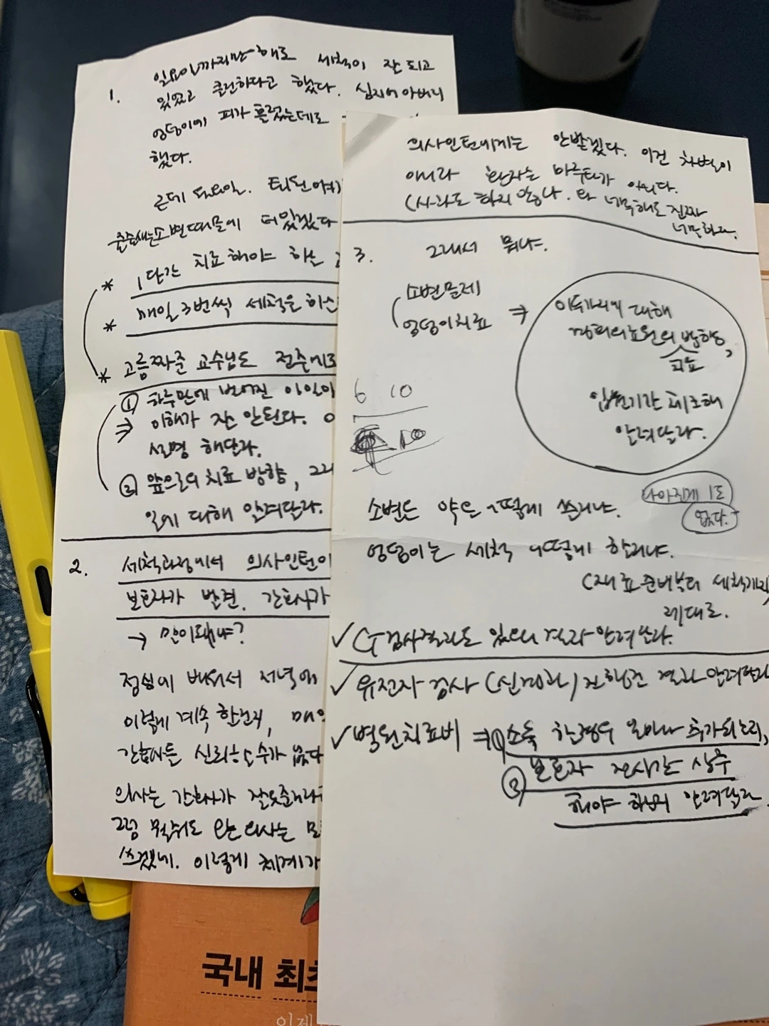 - 소독하는 교수에게 2분만 시간을 달라고 했다. 두 교수가 다른 말을 하고 있어 불안하고, 소독도 인턴들 세워놓고 지금 배워 저녁에 하게 하는 것도 이해가 안 된다고 말했다.