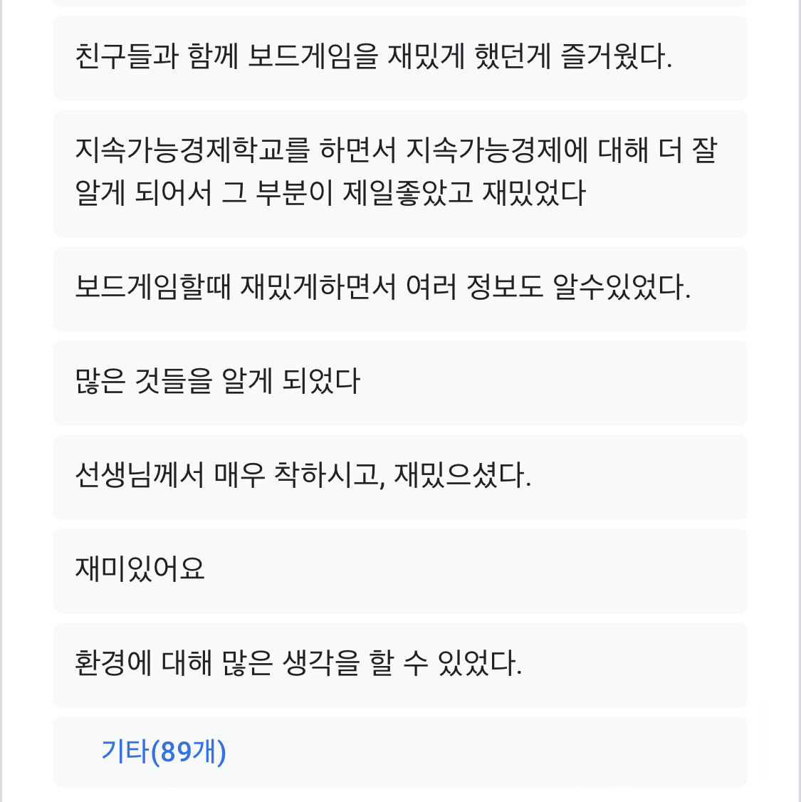 게임으로 ‘지속가능경제’를 해치는 요소들, 실천하는 요소들을 살펴보고, 이론교육에서 배운 가치를 퀴즈를 통해 맞추는 게임으로 구성했다. 교육에 참여한 친구들은 보드게임에 열정이었다. 내가 마이크를 들고 서서 이것저것 설명할 때보다 훨씬 더 적극적이고, 이해하려고 하고, 생각하려고 했다. 결국엔 배운 내용을 거의 다 맞추기까지 했다. 내가 그들의 흥미와 관심에만 불을 지펴준다면, 그 이후는 친구들의 몫이지 않을까?