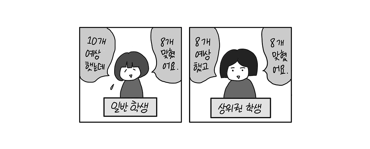 어떻게 하면 일에 대한 부담감을 없앨 수 있을까 고민하는 와중에, 예전에 본 다큐멘터리가 생각이 났다. <EBS 학교란 무엇인가-8부 0.1%의 비밀>에서 흥미로운 실험을 진행한다. 상위 0.1%의 학생 집단과 일반 학생 집단에게 25개의 단어를 제시하고, 제한 시간 안에 최대한 많이 기억하도록 요구한다. 그리고 특이한 점은, 얼마나 기억하는지 확인하기에 앞서 학생에게 자신이 몇 개나 쓸 수 있을지 ‘예측’해보게 한다는 것이다. 그 후 기억하는 단어를 직접 써보며 확인한 결과, 일반 학생과 상위권 학생의 기억력에는 두드러진 차이가 있지는 않았다. 일반 학생보다 더 못 기억한 상위권 학생도 있었으니 말이다. 그런데 차이점은 ‘예측한 개수의 정확성’이었다. 일반 학생은 모두 예측한 개수와 실제 개수가 일치하지 않았다. 너무 자신을 과대평가하거나 과소평가한 것이다. 그런데 상위권 학생은 많이 맞히든 그렇지 않든, 대부분이 정확하게 예측했다. 결국 실험의 요지는 기억력 자체가 아닌, 예측 능력의 중요성을 말하고자 함이었다. 실제로 메타인지라는 용어가 있다. 쉽게 말해 자기가 아는 것과 모르는 것을 정확하게 구분하는 능력이다.