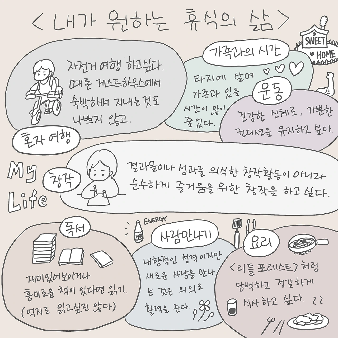 지금처럼 노동만 이어지는 삶을 사는 채로 나이가 들어 삶을 회고한다면, 조금은 씁쓸한 기분이 들 것만 같다. 지금의 삶은, 나다운 삶과는 조금 동떨어진 삶이라는 생각이 든다. 지금의 삶이 나쁜 건 아니지만, 분명하게 말할 수 있는 건, 내가 원하는 삶은 아니다.
