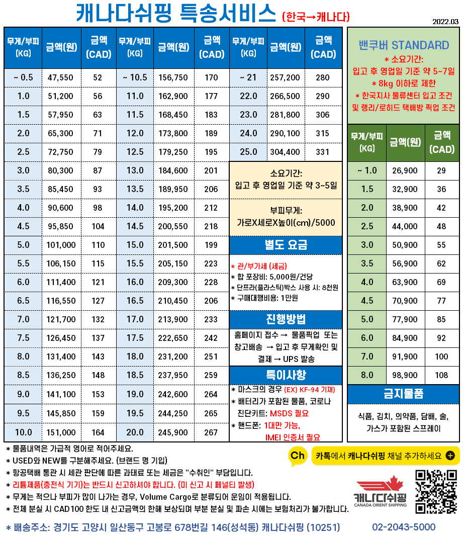캐나다쉬핑 운송비용 (2022년 3월 25일 기준)