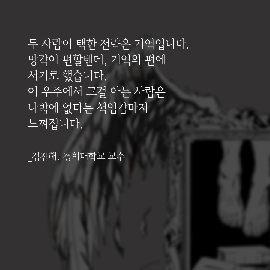 그리고 감사와 존경이 담긴 탕수육 한 그릇 만으로 추천사를 척척 써주신 강이관 감독님, 김진해 교수님, 조성원 교수님께 가슴 깊이 감사드립니다. 특히, '글이라는 건 자고로 이렇게 쓰는 것이다, 이 조무래기 시키들아!'라는 일침을 지극히도 우아하게 표현해 주신 김진해 교수님. 사람을 이렇게 울리기 있습니까? 많이 배웠습니다. 앞으로는 불평하는 글은 최대한 줄이고 세상을 이해하려는 글을 써보도록 하겠습니다.