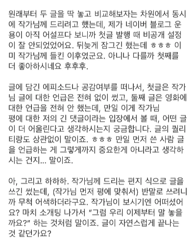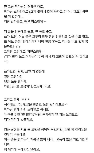 이 과정에서 편지 톤보다는 댓글 톤으로 가는 게 낫다는 얘기가 있었고, 가능하면 뒤에 쓰는 댓글 원고에는 앞에 써놓은 본문의 이야기를 언급하는 것이 좋겠다는 합의가 있었습니다. 아쉽게도 출판을 준비하면서 자기 얘기를 한 마디라도 더 떠들고 싶어서, 상대방의 본문 글에 대한 언급은 대부분 잘렸지만요. 예를 들어, 이연 작가님의 <밑줄만> 꼭지는 "곤경에 처한 사람을 모른 척 한 적 있나요? … 전 있어요."라는 문장으로 시작되는데, 제 글에서 이 질문에 대한 대답을 담은 부분은 나중에 삭제되었습니다.