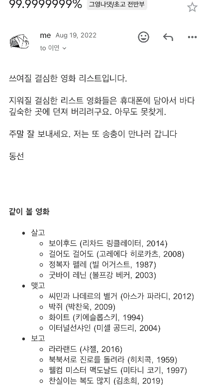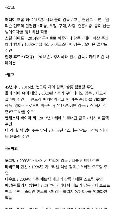 일단 한국 극장에서 개봉한 작품 중심으로 (OTT 전용 작품처럼 구독이 필요한 작품은 제외), 희귀영화보다는 많이 알려진 작품들 (네 ㅠㅠㅠ 그나마 많이 알려진 영화랍시고 골라낸 작품들입니다), 그리고 개봉한 지 5년 이상이 되어 2차 판권 흥행 수익에 영향이 없는 작품 위주로 골랐습니다. 그리고 세 가지 카테고리 - 살고, 보고, 맺고 - 에 어울리는 글을 뽑아낼 수 있는 작품들을 나열해 봤죠. 그래도 또 쓰다보면 결국 할 얘기가 많은 작품들을 고르게 되어 있어서 최종적으로 책에 실린 작품들과 최초에 선정된 영화들은 많이 달라지긴 했지만, 뭐, 이미 구상해 놓거나 써둔 글을 포기해야 한다고 해서 스트레스받거나 하는 일은 없었어요. 기본적으로 둘 다 워낙 말들이 많아서 그거 말고도 할 말이 넘쳐났거든요. 4000자, 원고지 20매, 책으로 5페이지 내외로 하자고 그리 약속을 해놓고 썼다 하면 4800자, 5천 자를 넘기기 일쑤였으니까요. 예전 노인네들은 말 많으면 공산당이라고 핀잔을 줬었는데… 저희도 서로를 공산당이라고 부르며 글을 써나갔습니다.