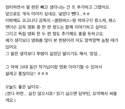 2023년 초에 갑자기 한국 방문을 할 일이 생기면서 겸사겸사 친애하는 공저자를 만날 기회가 있었습니다. 어우.. 어찌나 긴장되던지... 안 그래도 과민성 대장 증상이 심한데... 만나기 바로 직전까지 화장실을 들락날락했지 뭐예요 (손은 비눗칠해서 잘 씻었습니다). 같이 글을 쓰기 시작한 지 반년이 넘고 나서야 서로의 인연이 시작된 노원역 극장 <더 숲>에서 처음 이연 작가님을 뵙는데... 아니 이건, 절 보자마자 막 우시는 거예요. 어우.. 좀 무섭게 말이죠. 이건 뭐지? 나 냄새 나나? 그 짧은 시간 안에 얼마나 많은 걱정을 했는지...