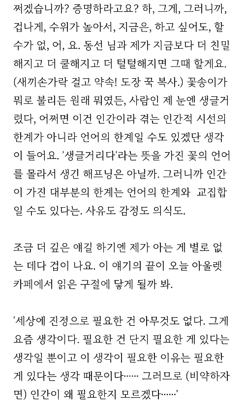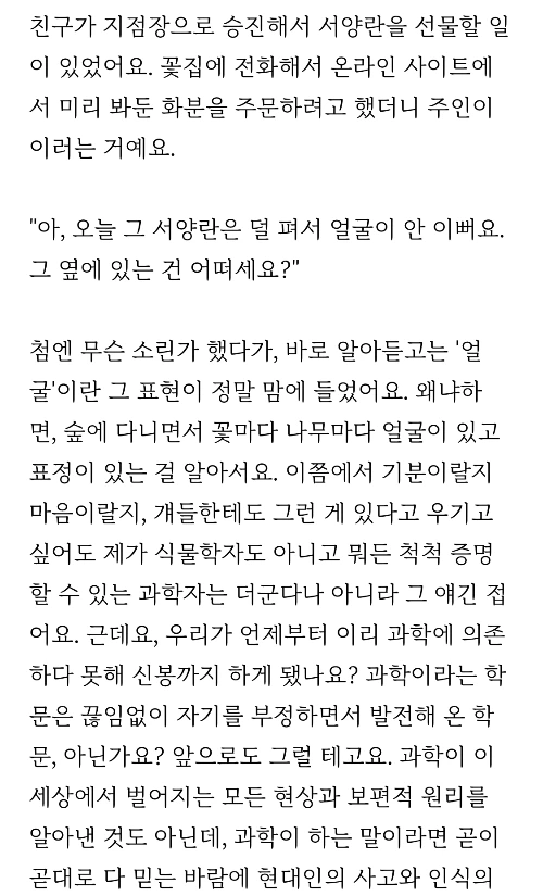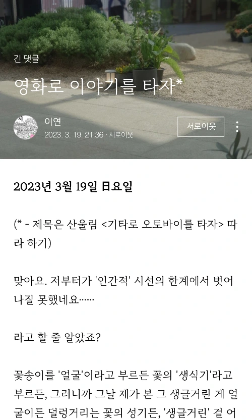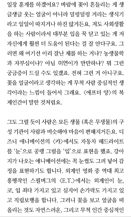 이렇게 해서 나온 글이 영화 <박쥐>에 대한 꼭지 <우주의 조화>와 <우주는 혼돈>이 되겠습니다. 그런데 이연 작가님의 글에서 꽃을 사람 얼굴에 비유하는 부분이 있었어요.