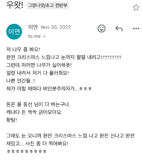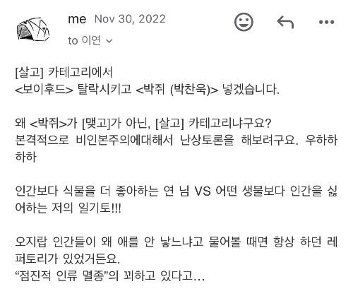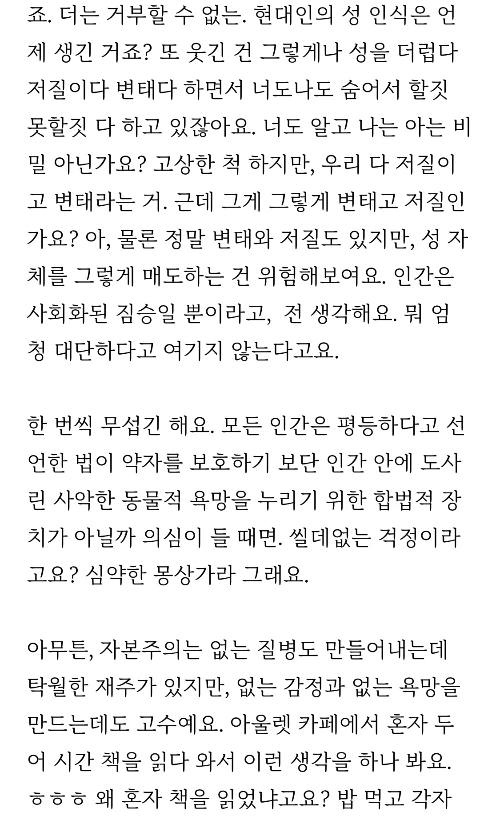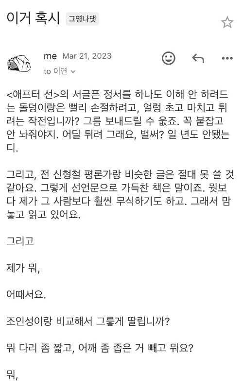 아. 정말. 이건 도무지 모르겠어요. 도대체 왜 그때 이연 작가님이 갑자기 글을 또 다 잠그고 댓글도 멈추고 잠적을 했는지 말이죠. 가까이 살면 리어 네이키드 초크라도 걸어서 실토를 하게 했을 텐데. 게다가 잠적하기 전에 뭐라고 뭐라고 화를 내는 말을 했었거든요 (당연히 이 글도 잠겨있습니다). 왜 그런 거 있잖아요. 정확히 무슨 얘기가 오고 갔는지 기억은 안 나는데 기분은 여전히 나쁜.