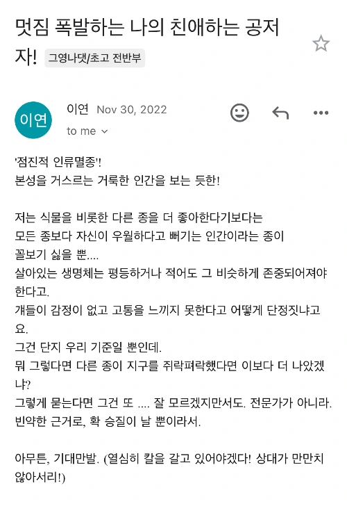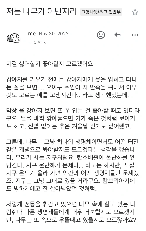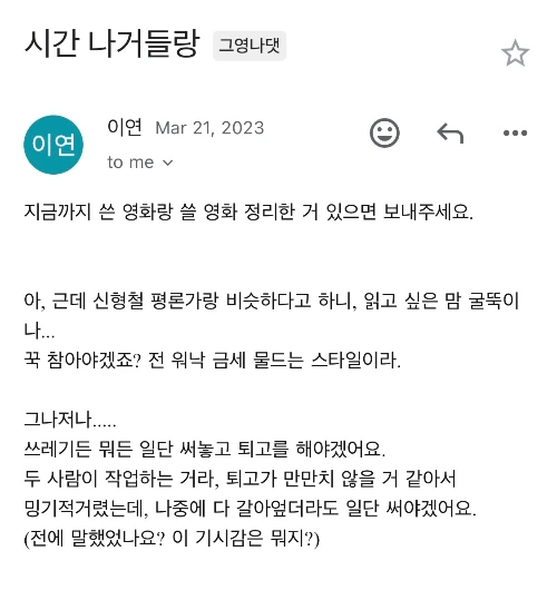 그러던 어느 날, 며칠의 침묵 뒤에 이연 작가님한테서 편지가 왔어요. 짧은 단답형 대답처럼. 빨리 원고를 끝내버리려는 듯한 뉘앙스의…