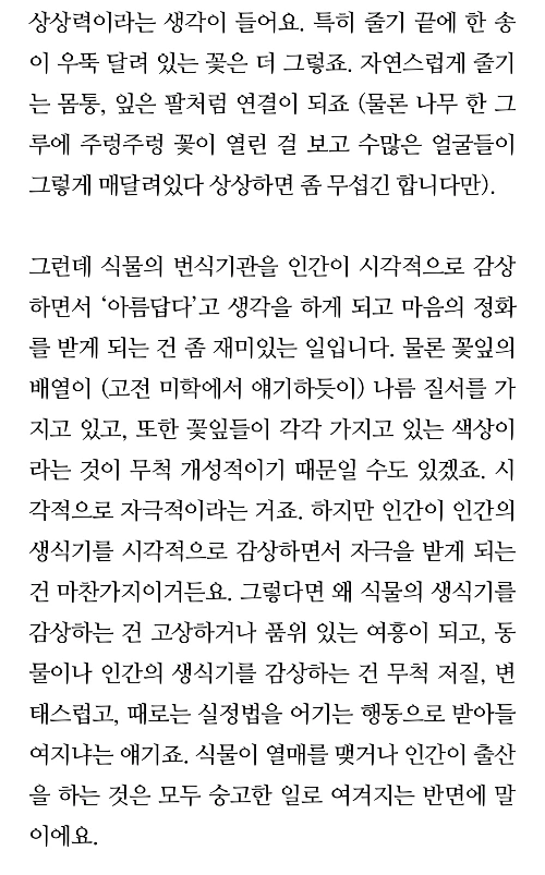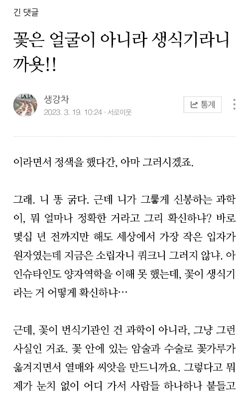 한 때 생물시간을 좋아했던 사람으로서, 그리고 사람 얼굴을 꽃에 갖다 붙이는 것에 좀 뾰족해져 있던 제가 단박에 반박 대댓글을 또 썼습니다. 좀 길지만, 맥락 이해를 위해 전문을 올립니다.