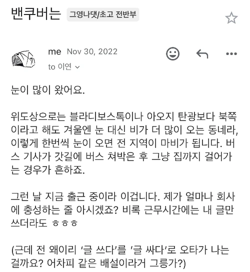 전 고층건물 시설 관리기사라서 정해진 휴일이나 휴가, 병가 외에는 긴급 상황 때문에 갑자기 쉬는 경우는 없습니다. 시설물에 이상이 발생하는 게 뭐 사람 사정 봐주면서 발생하진 않거든요. 코로나 시기에도 쉬지 못하고 출근했었고, 폭설이 내리든 폭우가 내리든 그것 때문에 또 문제가 생길 수 있기에 출근해야 합니다. 그날도 밤새 폭설이 내리는 바람에 도시 전체 교통이 마비되었던 날 아침이었어요. 선로가 얼어서 언제 올지 모르는 전철을 하염없이 기다리는 동안 사진을 한 장 찍어서 친애하는 공저자에게 보내지 않았겠어요? 꽁꽁 언 손을 호호 불어가면서.