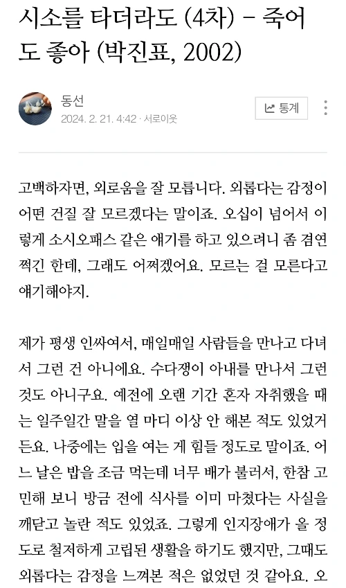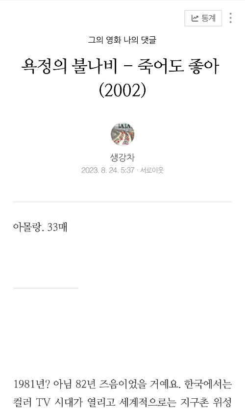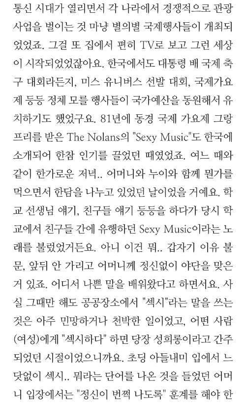 <죽어도 좋아>의 경우엔 한 바퀴를 뺑 돈 셈이었어요. 처음 쓸 때부터 우리 사회에서 '외로움'이라는 감정이 너무 과대평가받고 있는 게 아닌가 하는 생각이 들었었거든요. 마침 이연 작가님의 원고가 또 외로움에 관한 거였기도 하고, 인간의 삶의 기본은 '고독'이 아닌가.. 하는 생각이 들었던 시점이기도 했고요. 그래서 삶에 있어서 인간관계의 디폴트에 대해 썼는데, 갑자기 개봉당시에 검열로 인해서 제한 상영관에서만 상영을 허락받았던 상황이 생각났습니다. 동시에 이 영화가 노인들의 성생활에 대한 인식 변화를 주도했던 것도 생각이 났었죠. 그래서 곧바로 첫 원고를 폐기하고 한국 사회에서 성생활에 대한 인식에 대한 글로 바꿨습니다. 제가 처음 본 빨간책이었던 <욕정의 불나비>라는 제목으로 해서. 그런데, 그게 또 6,500자가 넘어가더라구요. 참.. 원래 말이 많은 공산당인데, 소재가 또 섹스니까 할 말이 얼마나 많았겠어요. 포 떼고 차 떼가면서 계속 고치다가 결국 4,000자 규모로 줄여 놓으니까 무슨 논술 줄거리 요약처럼 되어 버리더라니까요. 핵심 논제만 줄줄줄 늘어놓은 것 같은. 결국 다시 외로움에 대한 이야기로 돌아오게 되었습니다.