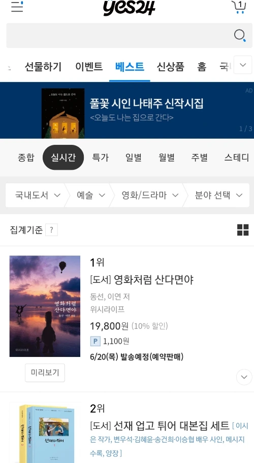 그래도 선주문을 받던 어느 날은 <선재 업고 튀어>를 누르고 실시간 1위를 하기도. 한두 푼씩 도와주신 지인 여러분께 다시 한번 감사를