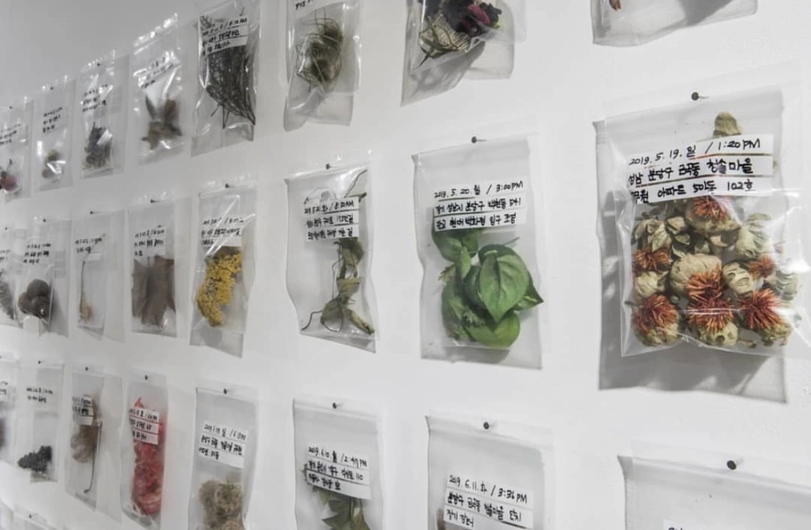 전시 제목에 이끌려 갤러리를 방문했다. '수집'이라는 키워드를 중심으로 여러 작가의 작품들이 함께 전시되어 있었다. 전시장 한쪽 벽을 식물 표본으로 가득 채운 취운 작가님의 작업이 시선을 끌었다. 하나씩 보면 얼핏 평범해 보이는 식물 표본이지만 채집 일시와 구체적인 채집 장소까지 메모해서 배열하니 질서 있고 아름다웠다. 이 작업을 만나기 전까지는 이런 것들도 작품이 될 수 있으려나 의심했겠지만, 이걸 보고 나니 당연히 작품이 될 수 있다는 생각이 들었다. 강하게 설득이 되었고 머쓱할 만큼이나 신선했다.