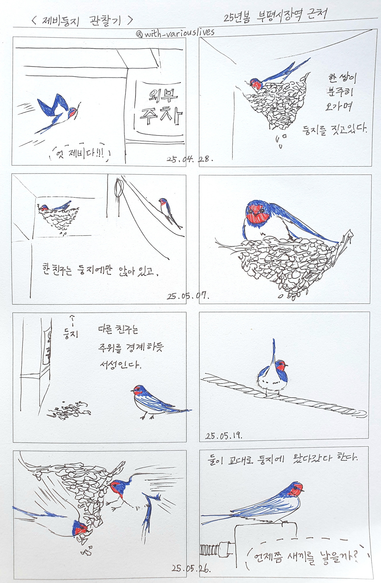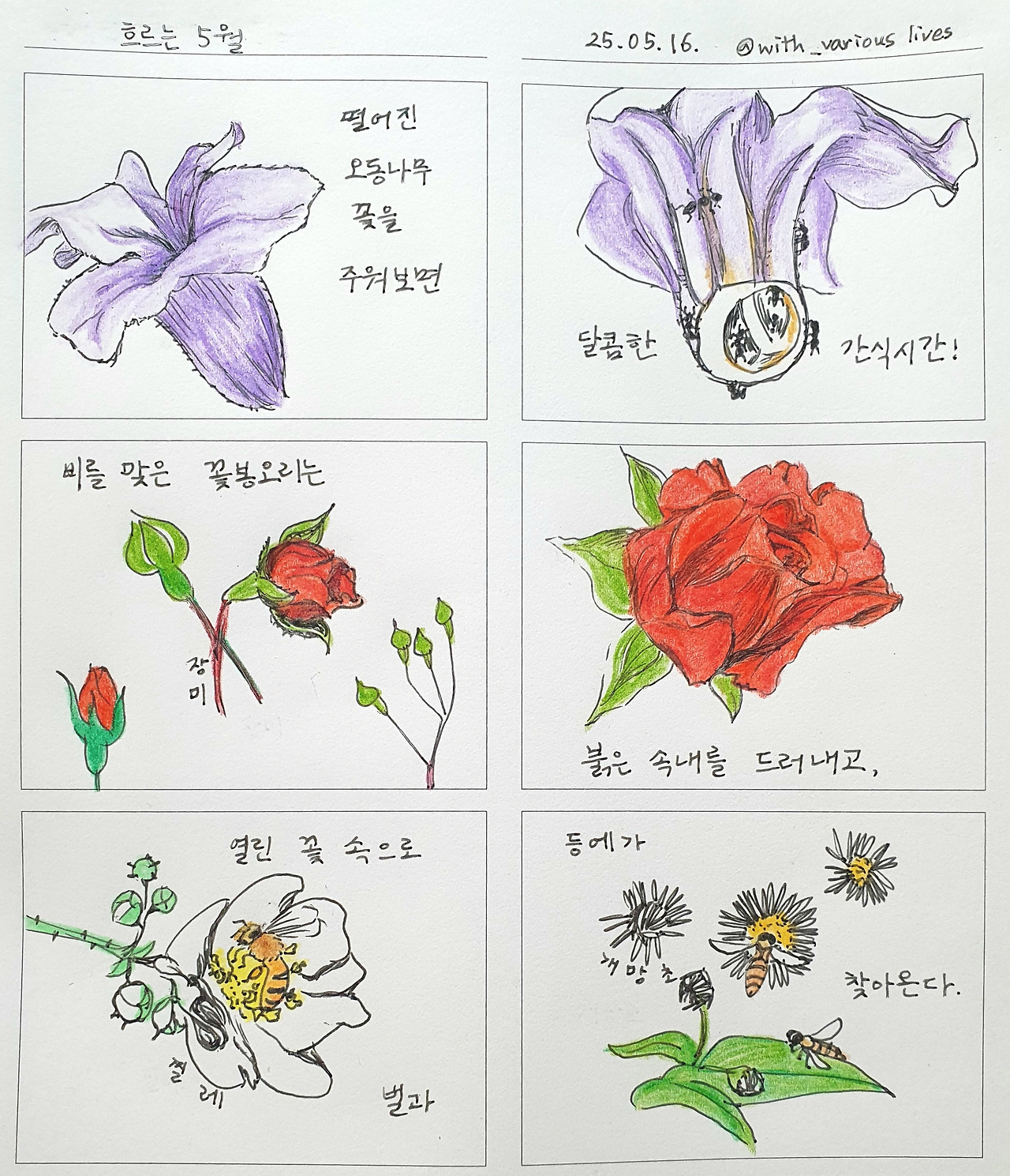 동물길을 함께 걸으며 자주 멈추어 작은 생명들을 관찰하던 사람들의 시선이 어느새 내 안에 들어왔듯이, 나의 시선이 다른 누군가의 산책에 자연스레 스며들기를 원해. 나는 산책을 하면서 사진에 담기지 않는 아름다움을 내가 느끼는 대로 그림에 담고는 해. 그 순간에 풍겨오는 향, 내 살에 닿는 햇빛과 바람, 온갖 생명이 움직이는 소리를 짚어가며 글을 쓰기도 하지. 오래도록 기억하고픈 그때의 감각을 잘 담아낸 자체로 만족스럽지만, 내 글과 그림이 다른 사람들의 마음에 가닿음으로써 자연과 연결되는 동지가 많아지면 좋겠다는 욕심이 생겨. 쌍안경을 통해 초코볼 같은 뱁새의 눈을 마주칠 때의 기쁨과 볼 빨간 직박구리가 맛있게 먹는 열매를 궁금해하는 경험을 나누고 싶어. 마음 가는 대로 걸으며 피어나는 궁금증을 함께 나누고 키워가는 동지로서, 때로는 안내자로서 하는 산책은 어떨까.