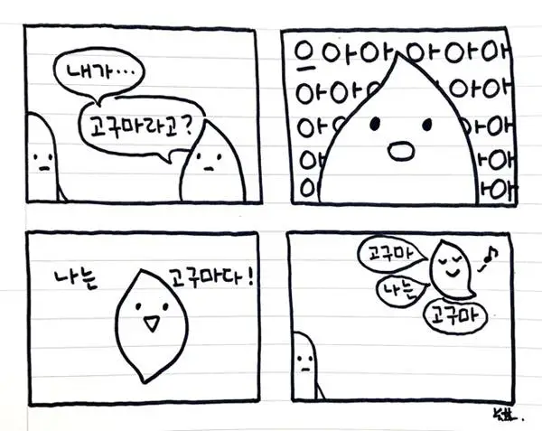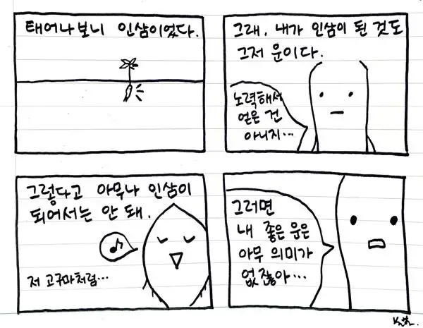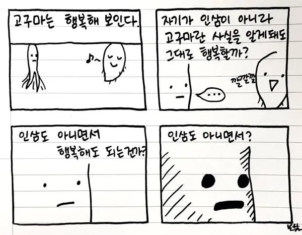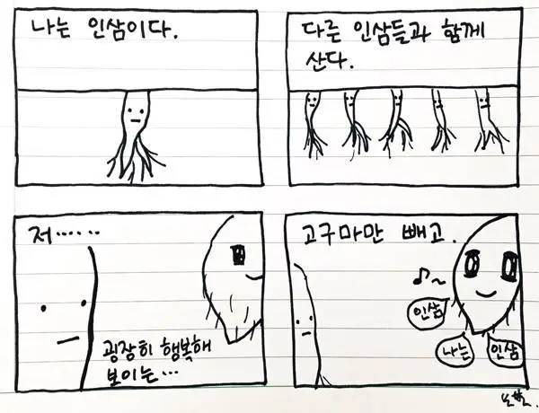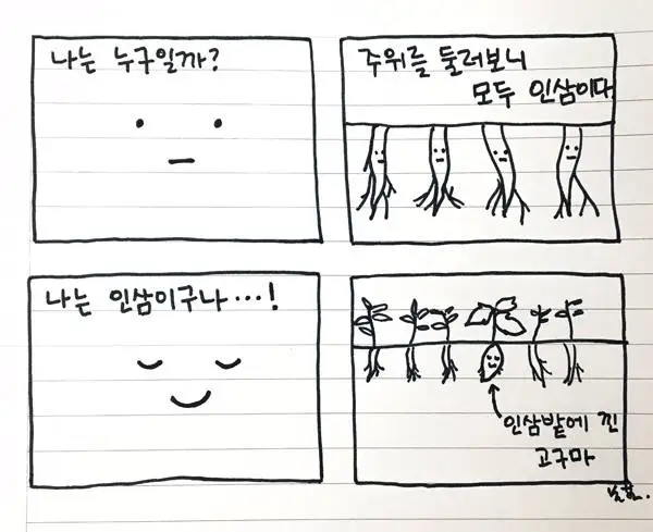 돌아보면 나는 늘 내가 고구마인걸 들키면 어쩌나 싶어 아등바등 살았다. 좋은 학벌, 좋은 직장, 좋은 배우자, 좋은 부모 등 모든 것을 줄을 세워 내가 어디쯤에 있나 확인하고 또 확인했다. 그리고 인삼을 부러워했던 거 같다. 하지만 나이가 들어서 좋은 건 이제 고구마의 삶을 즐길 줄 아는 여유가 생겼다는 점이다.