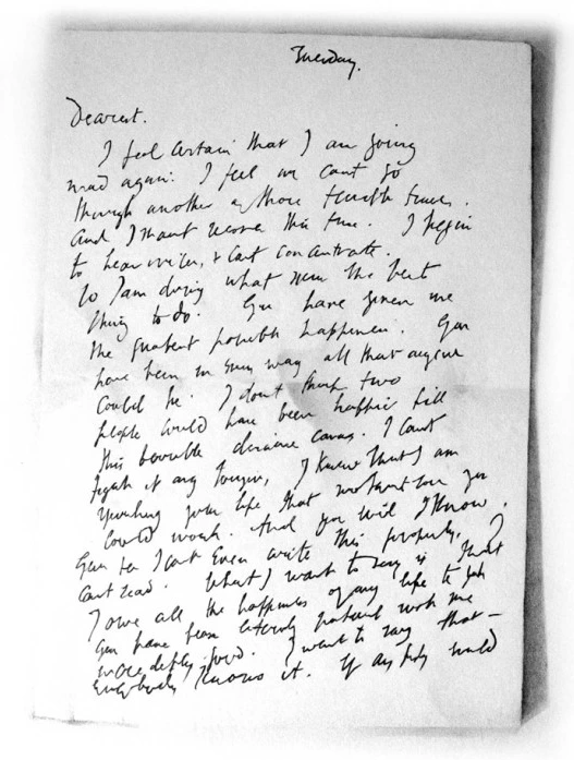 I feel certain I am gonig mad again. I feel we can't go through another of those terrible times. And I shan's recover this time. I begin to hear voices, and I can't concentrate. So I am doing what seems the best thing to do.