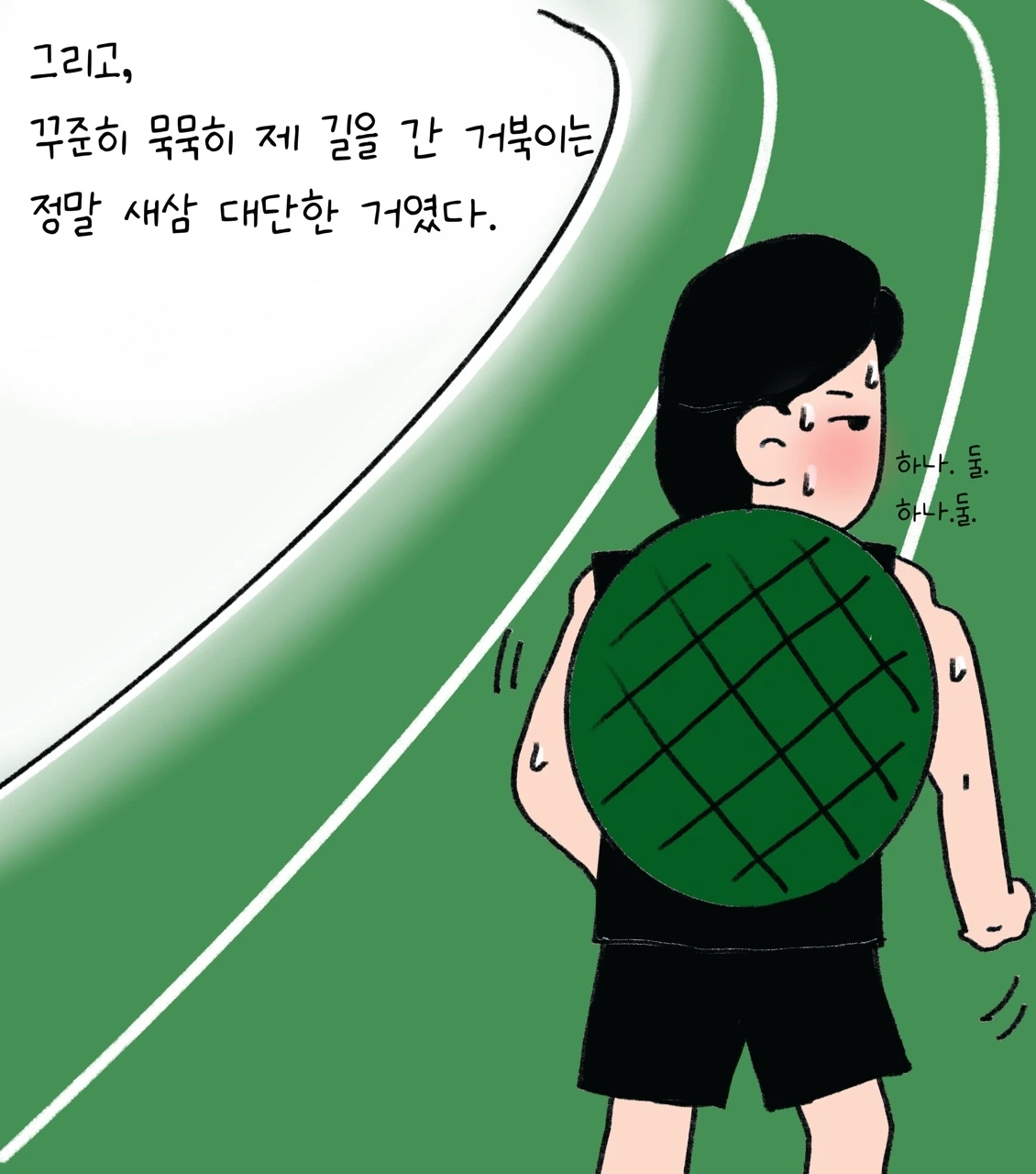 그리고, 묵묵히 제길을 간 거북이 역시 새삼 대단하다고 느꼈다. 토끼를 이겨서만이 아니라- 같이 달리는 상대가 누구든 , 상대방이 어떤 행동을 하든, 본인의 길을 느리지만 결국 걸어가는 사람. 결국 빨리 가는 것보다 중요한 것은 꾸준히 가는 것이겠구나.
