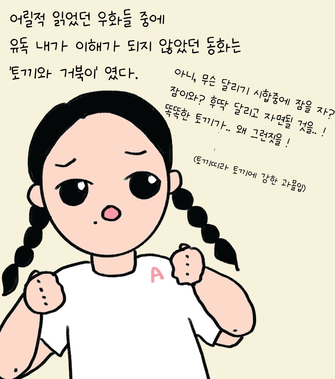 내가 토끼띠라 그런가. 어릴 적부터 동화 속에 나오는 토끼를 좋아했다. 토끼들은 늘 귀엽고 지혜롭고 위기를 맞아도 재치 있게 넘겼다. 그런 토끼가 참 좋았다. 하지만 ‘토끼와 거북이’ 동화 속 토끼는 유독 이해가 가질 않았다. 아무리 상대가 (만만해 보이는) 거북이라고 해도, 어떻게 달리기 시합 중에 잠을 잘 생각을 하지? 다 이긴 경기인데 어떻게 그 잠깐 잠을 못 참고 자버려서 질 수가 있지? 나에게 달리기 도중 잠을 선택한 토끼는 항상 이해불가의 - 살짝은 한심해 보이는 - 캐릭터였다.