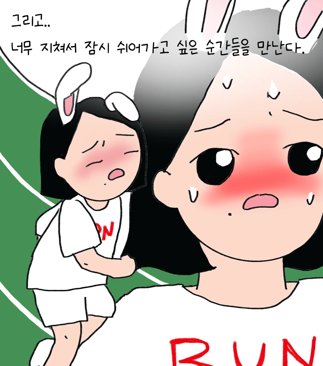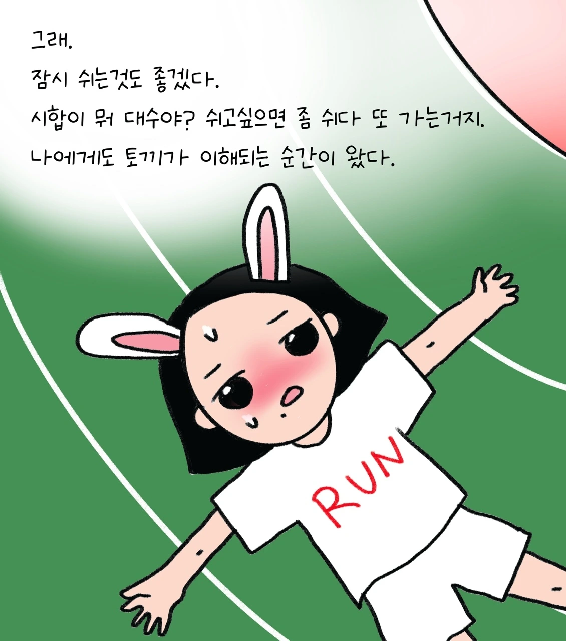 그런데 내가 너무 지쳐보니- 무엇을 위해 , 어디로 달려야 하는지 아무것도 보이지 않더라. 그래서 잠깐 쉬어보는 것도 괜찮다는 생각이 들었다. 너무너무 지친 35살의 출근길. 문득 나는 토끼가 왜 달리기 시합 중에 잠을 잤는지 알 것 같았다. 늘 달리기만 하던 토끼도 잠깐 쉬고 싶었겠지. 남들 눈엔 거북이와의 시합만 보였겠지만 , 다들 거북이에게 진 토끼를 비웃었겠지만. 토끼 입장에서 거북이한테 한번 진 게 뭐 얼마나 큰 리스크가 되겠나 싶었다. 질 수도 있지. 나보다 느리다고 생각한 사람한테 추월당하고 또다시 만나고 또 각자 다른 곳으로 가고 할 수 있지. 그게 뭐 그리 대수겠는가, 쉬고 싶으면 조금 쉬었다가 또다시 가면 되는 거지. 나에게도 토끼가 이해되는 순간이 왔다.