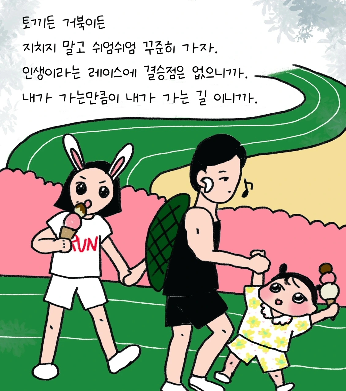 내가 토끼든, 거북이든 지치지 말고 쉬엄쉬엄 꾸준히 가고 싶다. 살아보니 결국 인생이라는 레이스는 정해진 결승점도 1등도 꼴등도 없는 것 같다. 누군가와 산책하듯 손잡고 천천히 갈 수도 있고 잠시 쉬다가 꽃도 보고 도시락도 먹을 수 있고. 그저 내가 가는 만큼이 내가 가는 길이니까.
