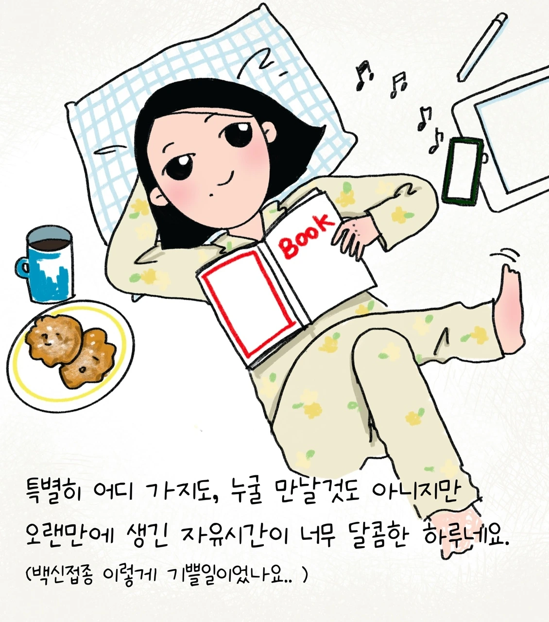 시어머님은 혹여 무리하면 안 된다고 어젯밤과 오늘 밤 아가를 어머님 댁에서 재워주시기로 하셨고, 간만의 아가가 없는 휴일- 집에서 소소하게 빈둥거리는 오늘 하루가 너무 달콤하다. 이게 ‘자유의 맛’ 인가 보다. 주말에도 나보다 부지런한 아가가 일어나 놀아달라고 외쳐대는 통에 늦잠을 자본 게 언제인가. 집에서 내린 따뜻한 아메리카노에 배달시킨 슈크림 한 조각, 미뤄왔던 책 읽기. 심지어 오늘 브런치에 글도 두 편이나 올리고 있는 중이다. 다음 2차 백신 접종 날을 달력에 체크하고 이렇게 소소하게 누려보는 나의 자유에 , 그리고 이 자유를 허락해주신- 아이를 봐주시는 어머님과, 사랑스러운 우리 아가에게 또 건강하게 이렇게 자유를 누릴 수 있는 내 몸에게 감사한 마음을 전하고 싶다.