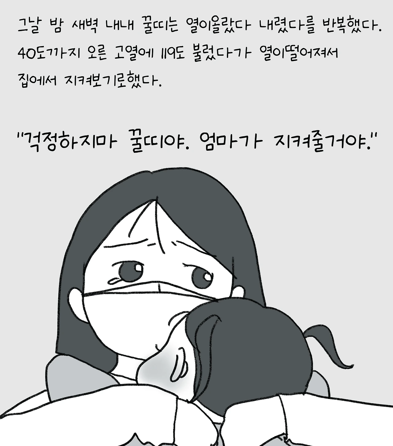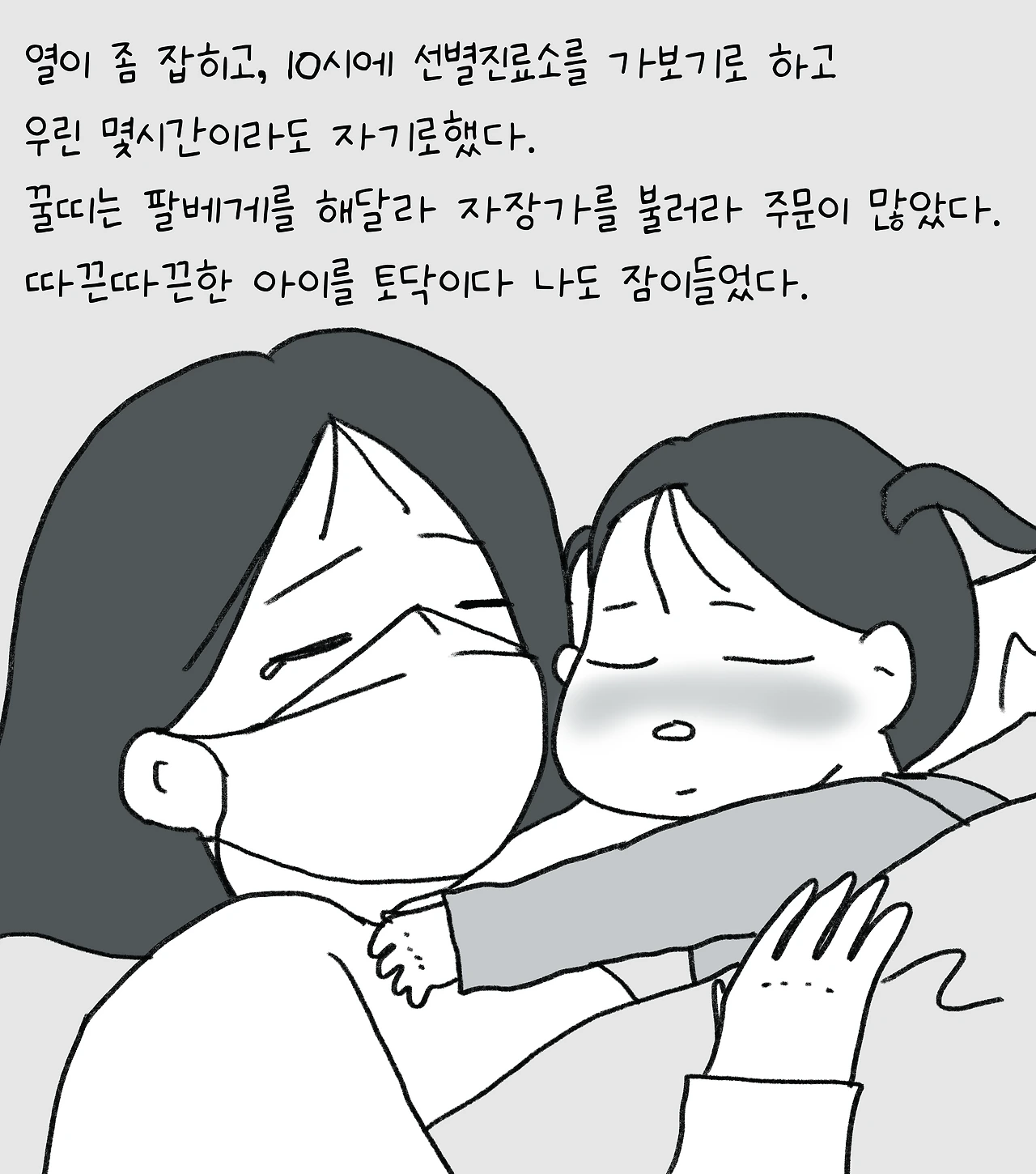 남편과 나는 서둘러 마스크를 꼈다. 이미 늦었을지도 모르지만. 하나 남은 키트는 내 콧속으로 들어갔다. 나는 한 줄. 음성이었다. 38.9 도 까지 올랐던 열이 몇 시간 후 36.6도까지 떨어지고 아이는 졸려서 내 품에 안겨 잠이 들었다. 일단은 열이 잡혔다는 안도감에 남편과 나는 까무룩 잠이 들었다.