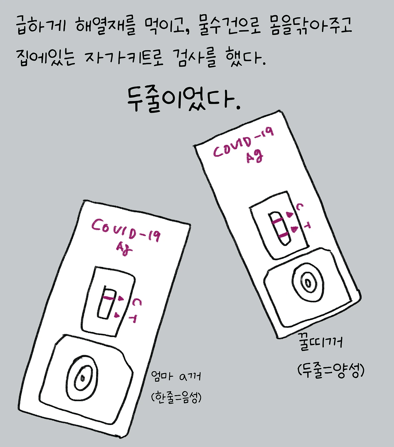 (워킹맘인 내가 출근하면 아이를 봐주시는 ) 시어머니 댁에 감기약과 교차 해열재 등이 대부분 있어서 일단 어머님께 전화를 드리고(어머님도 공지사항 보고 남편에게 전화한 참이었다.) 서둘러 집에 있는 해열제를 먹이고, 인터넷 검색해서 열 내리는 법, 코로나, 코로나 확진 등을 검색했다. 머리가 멍해지고 무서웠다. 일단 미온수로 물수건을 만들어서 아이 몸을 닦아주면 좋다고 해서 차갑다고 싫다고 칭얼대는 아이를 붙들고 한참을 실랑이를 했다. 그러다 집에 코로나 자가 키트가 2개 있다는 게 생각났다. 떨리는 맘으로 아이의 코에 면봉을 넣었다.(나는 도저히 못하겠어서 남편이 넣었다.)