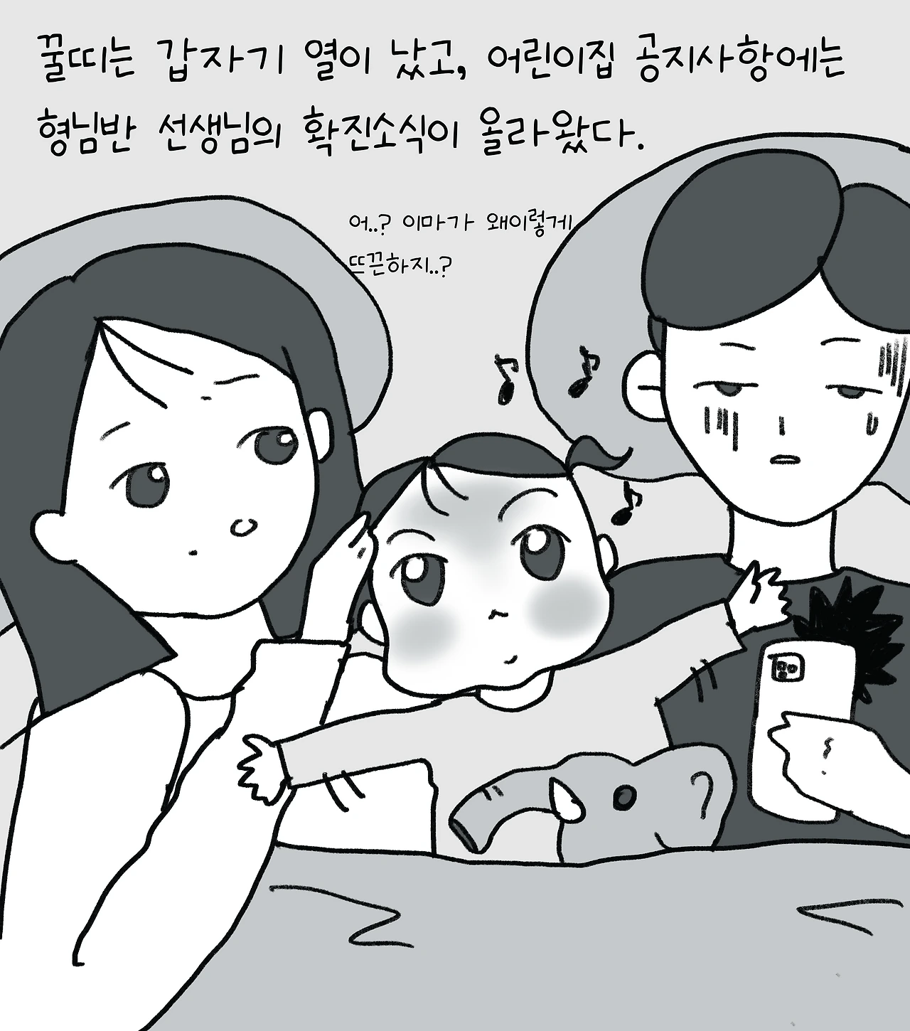 설 연휴를 앞둔 주말. 일요일 저녁. 남편과 나 우리 딸(=꿀 띠)은 이불속에서 뒹굴거리며 자장가를 부르고 장난을 치고 있었다. 아이의 곱실거리는 잔머리를 쓸어 넘겨주다가 문득 아이 이마가 뜨끈한 것을 느꼈다. 급히 체온을 재보니 38.5였다. 깜짝 놀라 해열재를 찾고 오늘 기침 한번 콧물 한번 안 흘리던 애가 왜 이러지 하고 놀라고 있는데 남편이 어린이집 공지사항에 형님반 담임선생님이 코로나 확진 판정을 받았고, 꿀 띠네 반 선생님과 원장 선생님 등은 오늘 검사를 받은 상황이니 형님반 아이들은 모두 검사를 받아주고 다른 반 아이들도 가능하면 검사를 받아달라는 내용이 떴다고 말했다.