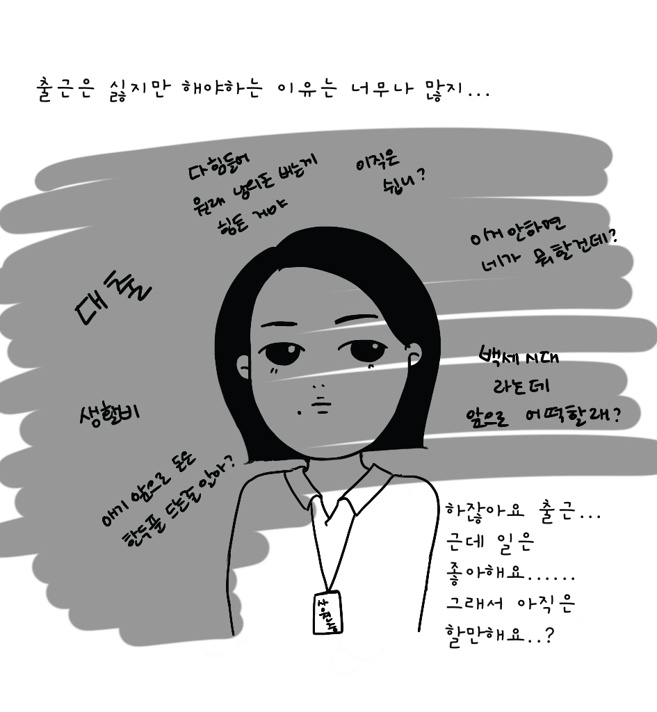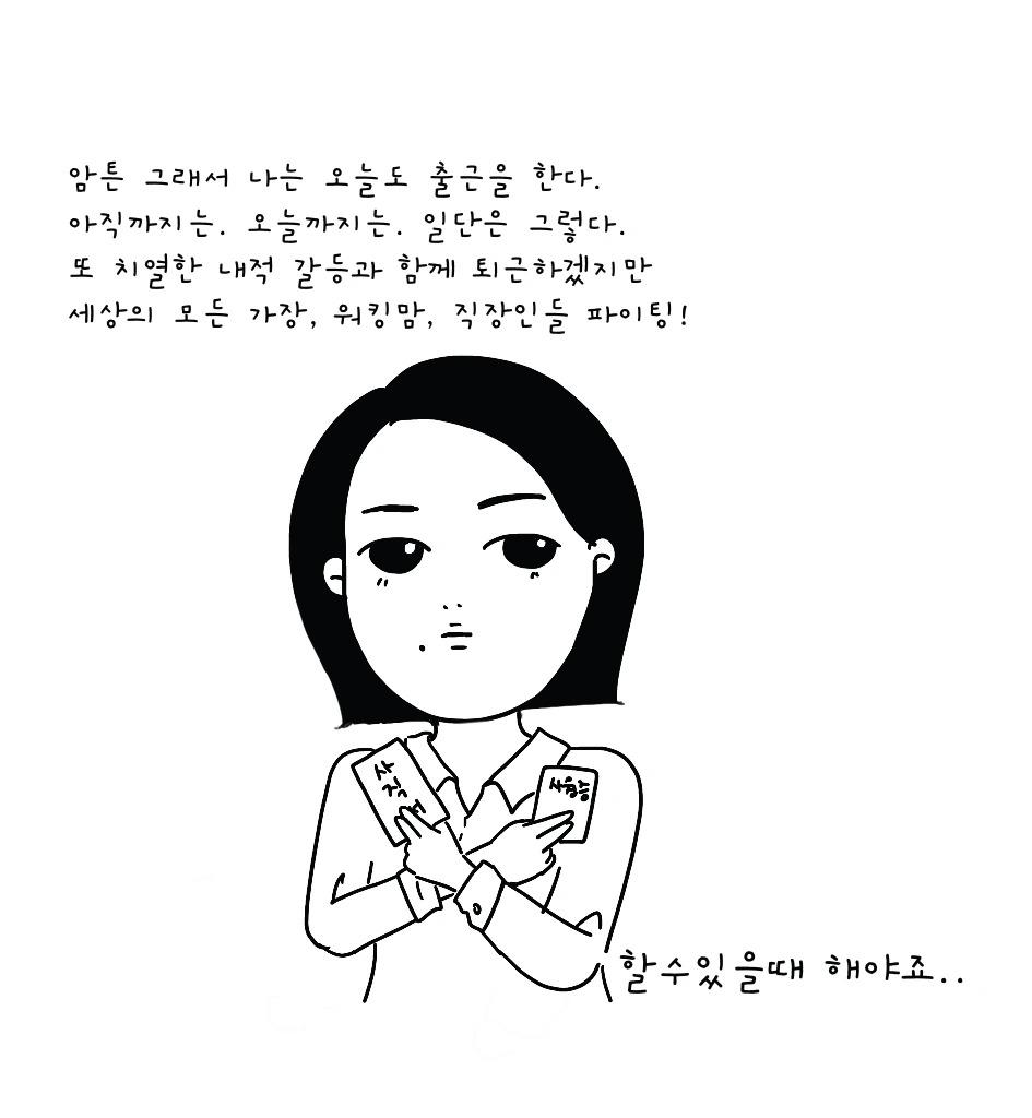 백세시대니까 벌 수 있을 때 벌자. 전세 사니까 자가 마련하려면, 대출받으려면 다니자. 이 일이 아직은 나에겐 가장 쉬우니까 다니자. 저 쪼끄만 생명체(우리 아가) 앞으로 들어가는 돈이 장난 아니고 앞으로도 계속 돈이 필요하니까 다니자. 일을 ‘할 수 있을 때’ 하자.