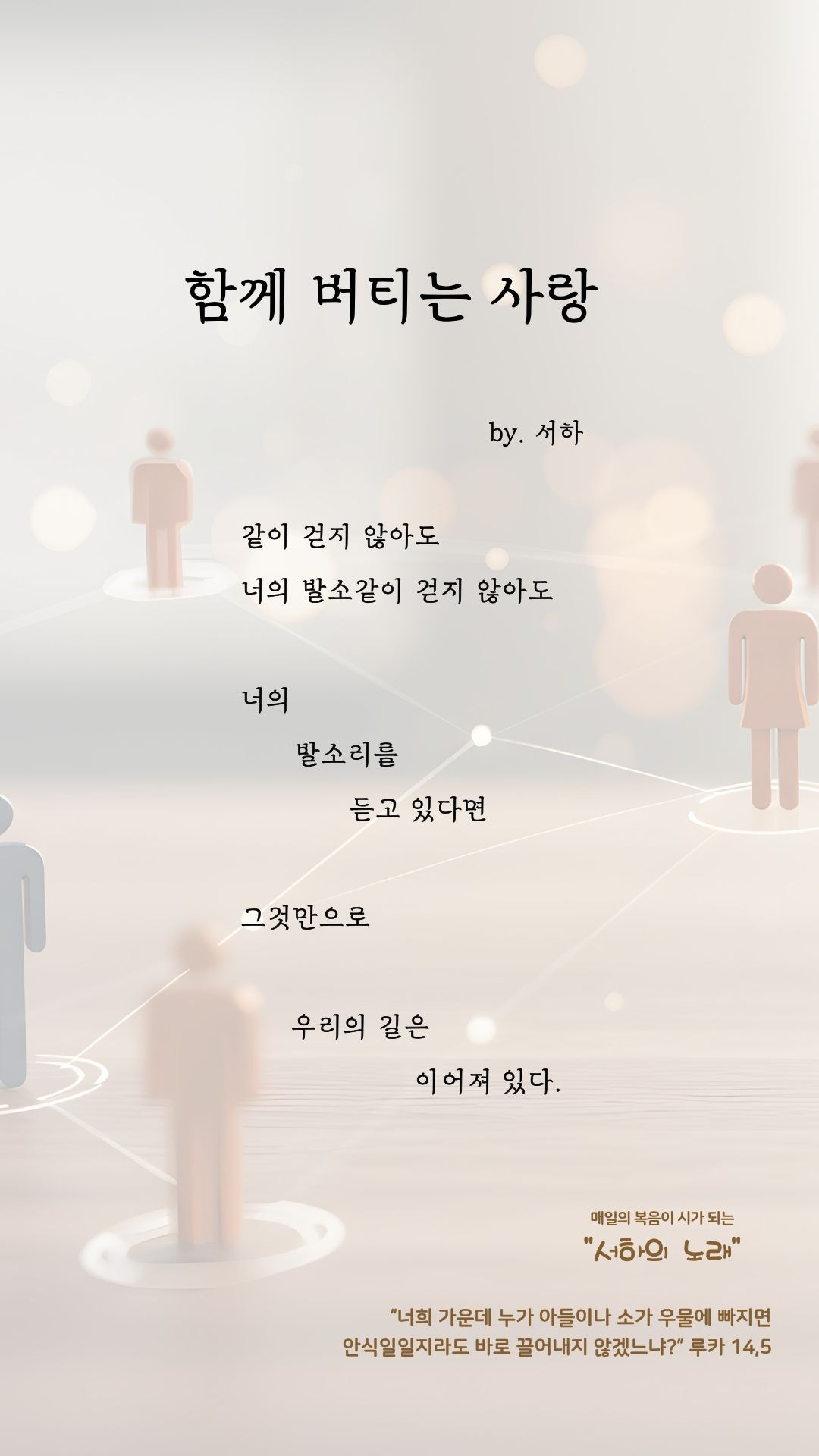 내 주변에도 있지 않을까. 차마 입으로 도움을 청하지 못하는 존재들. 늘 "괜찮아요"라고 말하지만, 사실은 마음이 지쳐 있는 동료. 늘 웃고 있지만, 속으로는 무너져 있는 친구. "나는 괜찮아"라며 버텨왔던, 바로 나 자신. 사랑은 말을 기다리지 않는다. 고통이 시선을 기다리고 있을 때, 그 시선을 돌리는 순간 이미 사랑은 시작된다.