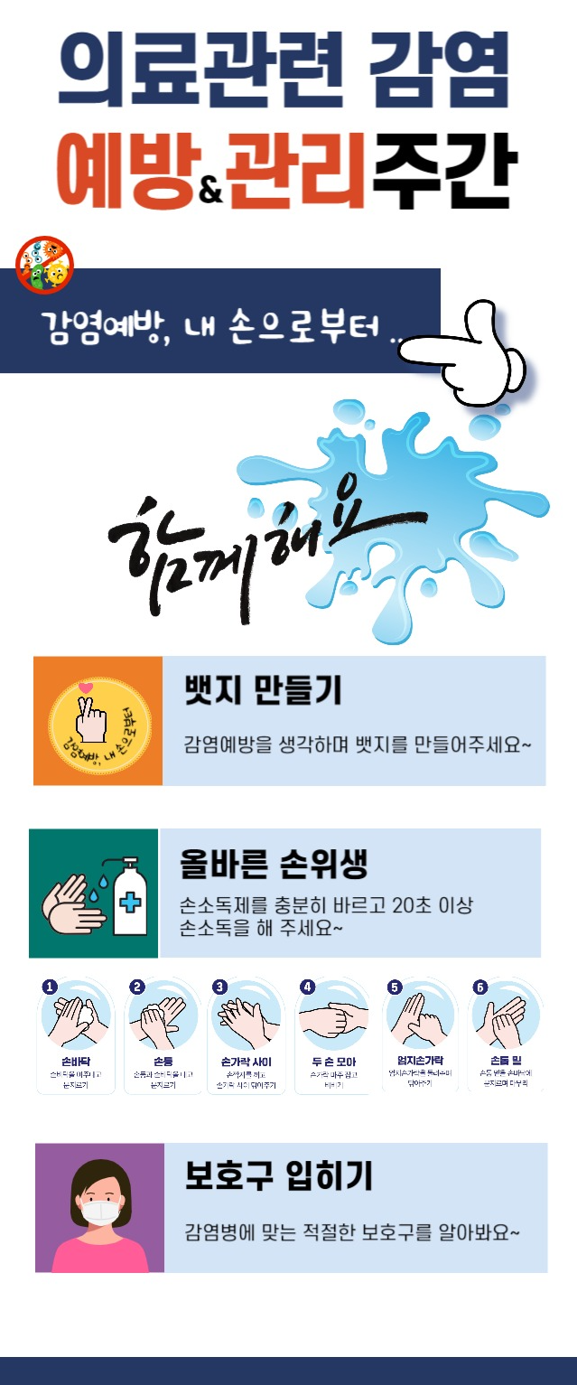 주간행사는 평소 딱딱하게 느껴질 수 있는 감염관리 활동을 좀 더 친숙하고 적극적으로 다가가게 하는 좋은 기회가 됩니다.