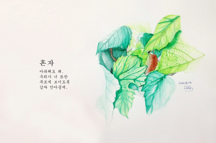 포도나무에서 잎사귀를 보았던 날 나는 몇 년 만에 수채화로 그림을 그렸다. 방법도 몰라 너무 엉망으로 그렸다. 꽃을 예쁘게 그리는 지인의 블로그를 보고 열심히 참고하기도 하고 실례를 무릅쓰고 방법을 묻기도 하며 부단히 애를 썼다. 그리고 그것을 다 그렸을 때 비로소 나는 스스로 내게 내민 다른 이들의 푸르름을 받아 내 몸 위로 덮는 느낌을 받았다.