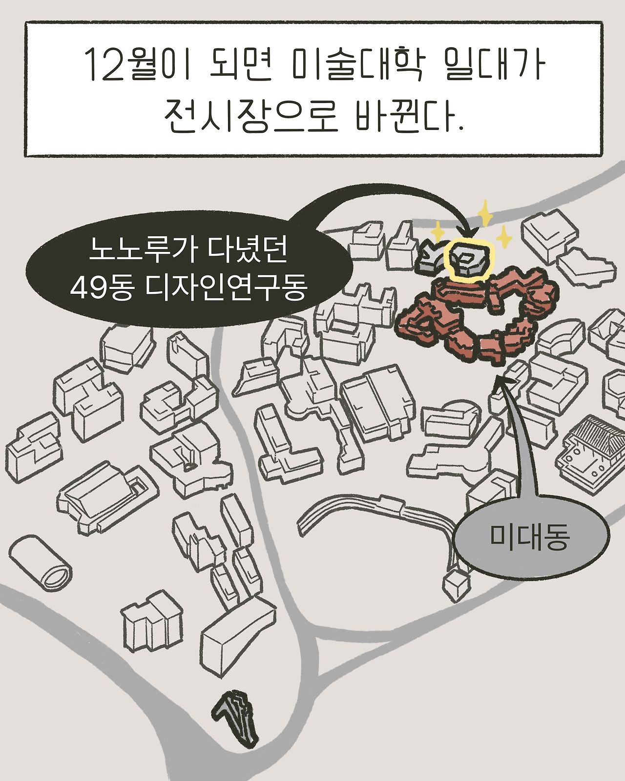 50동을 기점으로 주변의 미대동 중에(지도를 다시 보니 예술관 1, 2, 3으로 바뀌었네?)