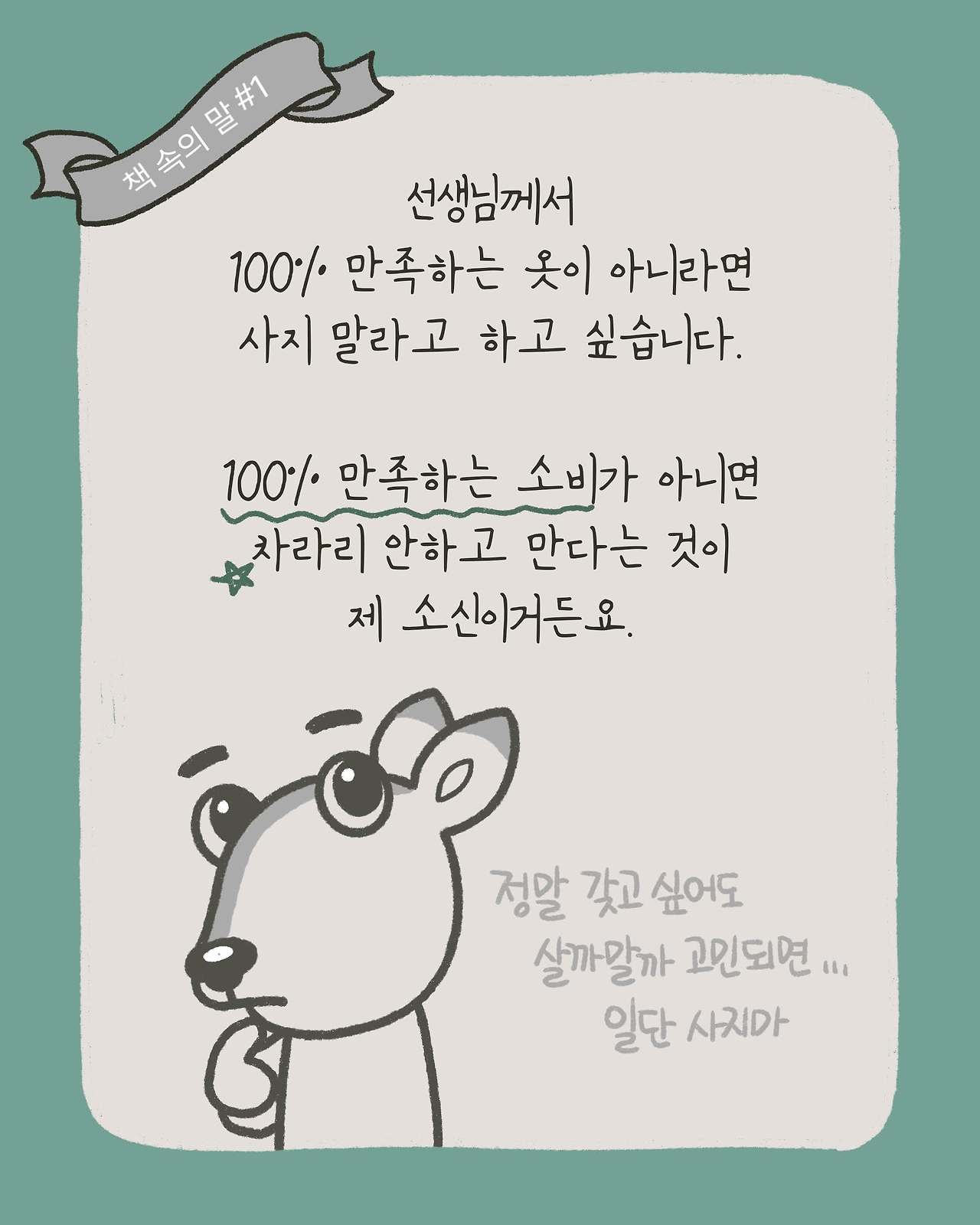 "제 생각은 좀 다릅니다. 선생님께서 100% 만족하는 옷이 아니라면 사지 말라고 하고 싶습니다. 100% 만족하는 소비가 아니면 차라리 안 하고 만다는 것이 제 소신이거든요. 차라리 어떻게든 맘에 드는 물건을 손에 넣을 방법을 생각해 보세요."